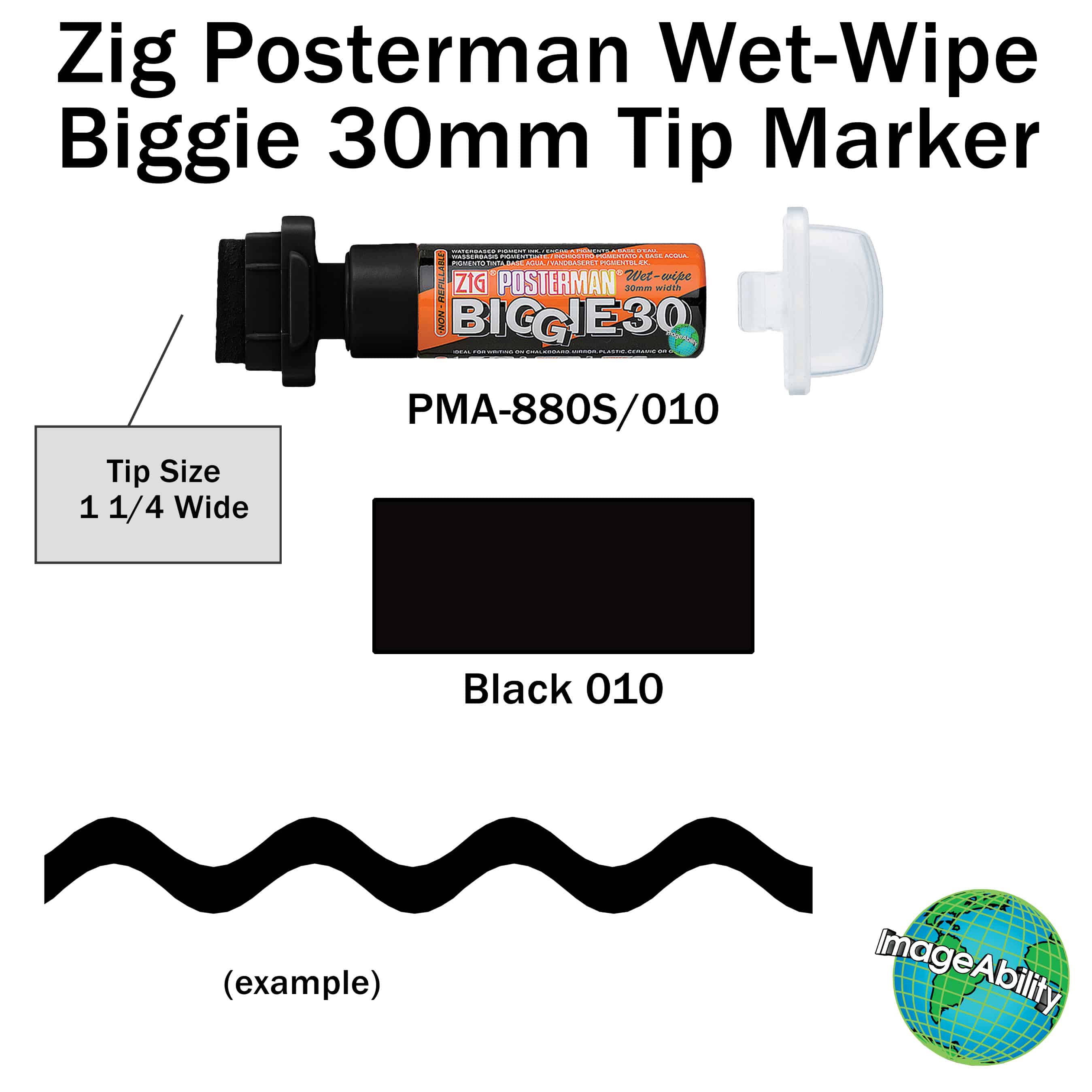 Black wet-wipe BIGGIE 30mm tip marker features a wide tip for making thick lines. They provide customers a quality liquid chalk ink that is highly opaque. The markers can be used on a variety of surfaces, like Cohas products, classic chalkboards, glass, plastic and more. They are perfect for use adding lettering and decorative art to nonporous surfaces.