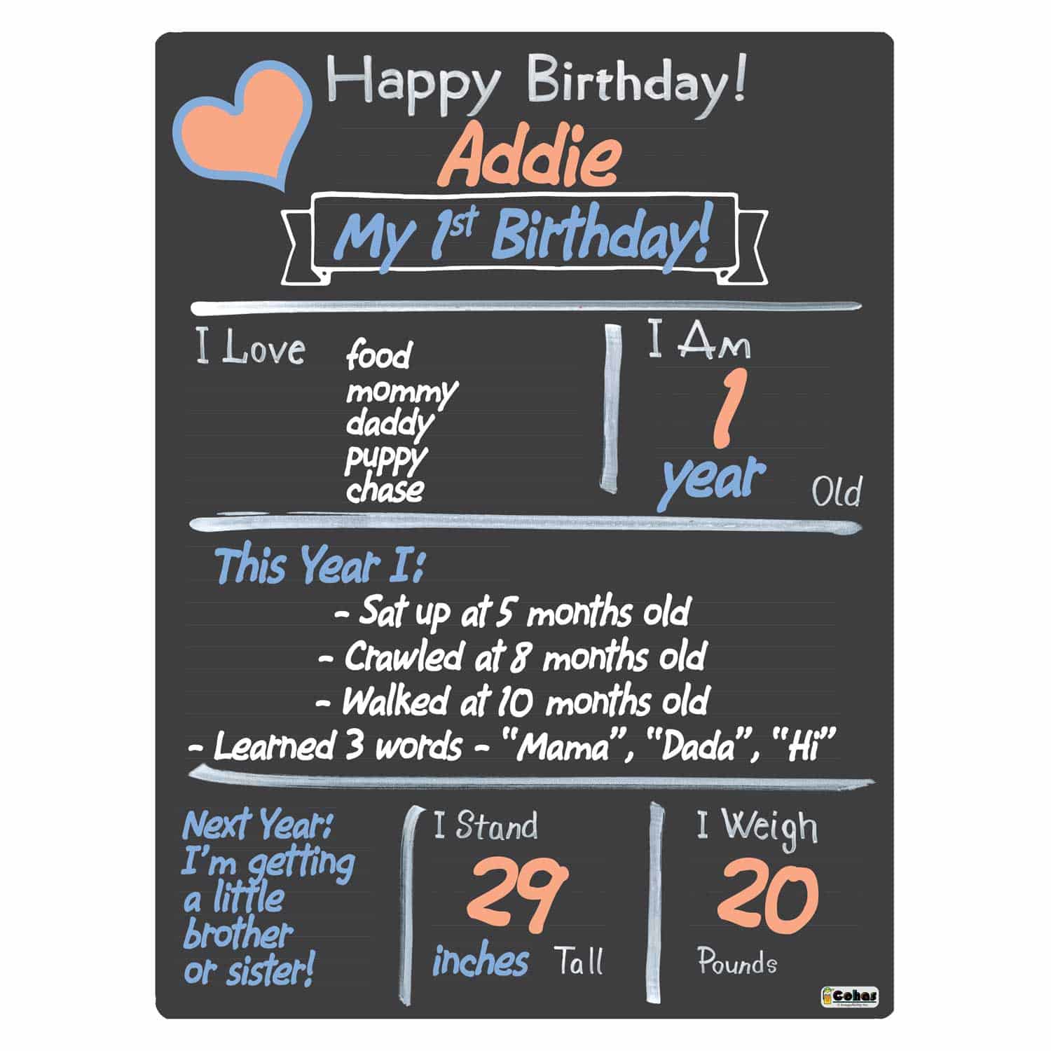 Blank design your own birthday milestone boards feature a chalkboard-style surface and real chalk artwork. They are perfect for capturing memories and watching your children grow year after year. The boards feature faint guidelines, to ensure writing is neat and straight; a matte finish, to reduce glare from cameras and lighting; and round, smooth corners, to prevent scratching or scraping little fingers.