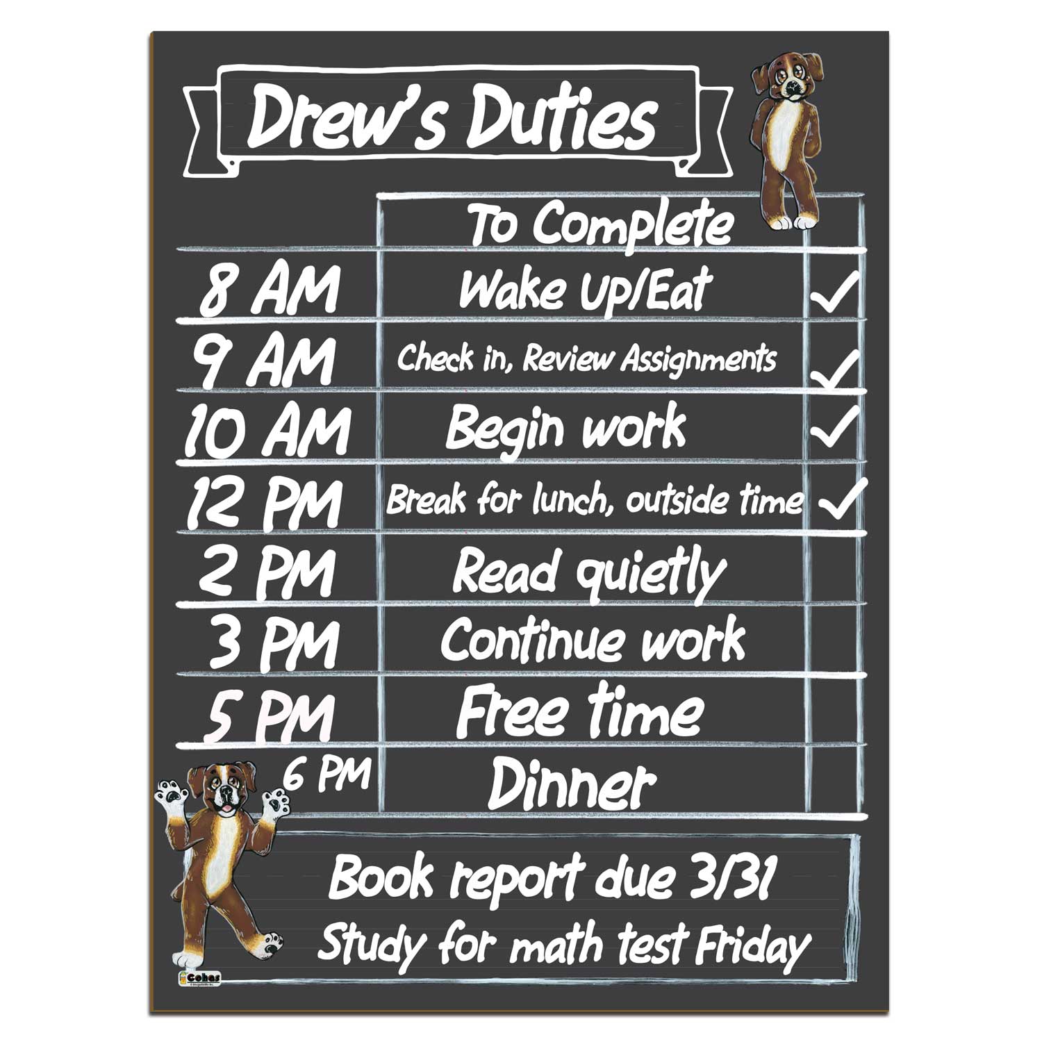 Boxer mascot chalkboard daily planners feature a chalkboard style surface mounted to a hardboard that can be hung on the wall. They are perfect for remote learning and homeschooling schedules each day. The boards feature real chalk artwork; chalk lines and boxes to write and mark complete each task; and a box at the bottom of the chart to write notes, rewards, reminders, and words of encouragement for your family.