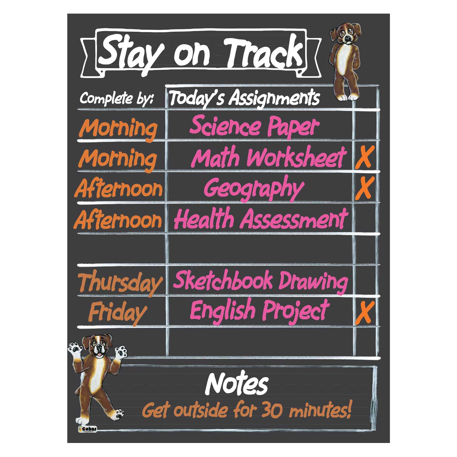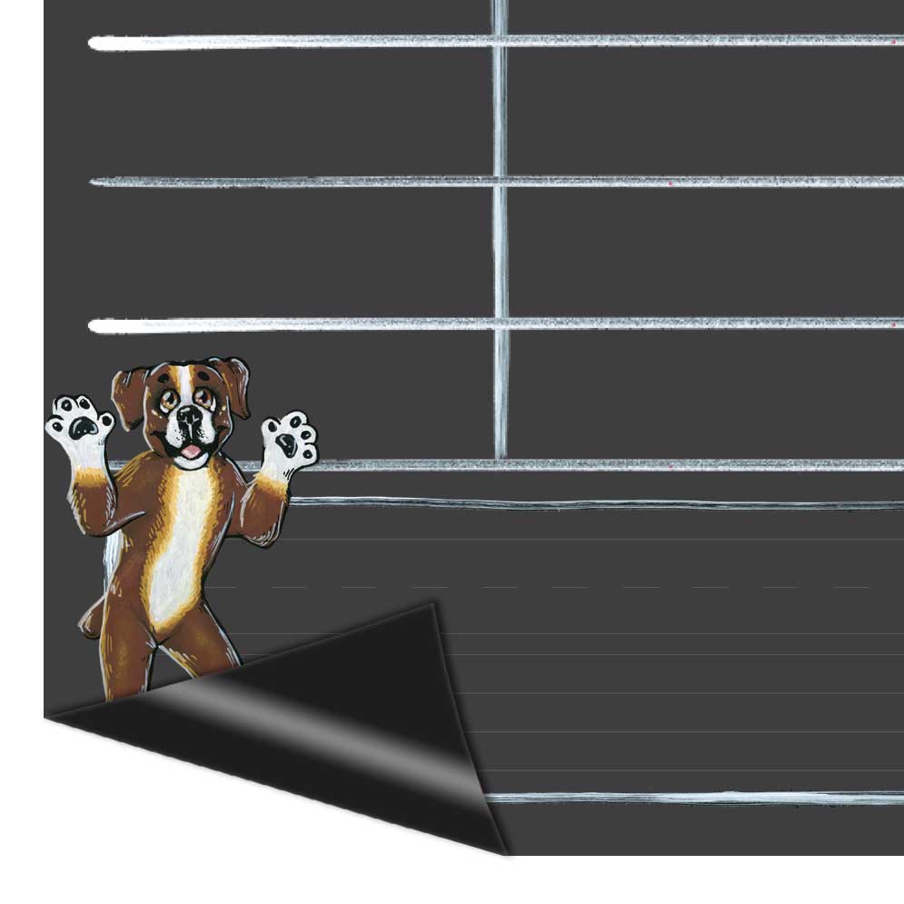 Boxer mascot magnetic backed daily planners feature a chalkboard style surface on a magnetic backed flexible board that can be hung on a fridge or other metal surface. They are perfect for remote learning and homeschooling schedules each day. The boards feature real chalk artwork; chalk lines and boxes to write and mark complete each task; and a box at the bottom of the chart to write notes, rewards, reminders, and words of encouragement for your family.