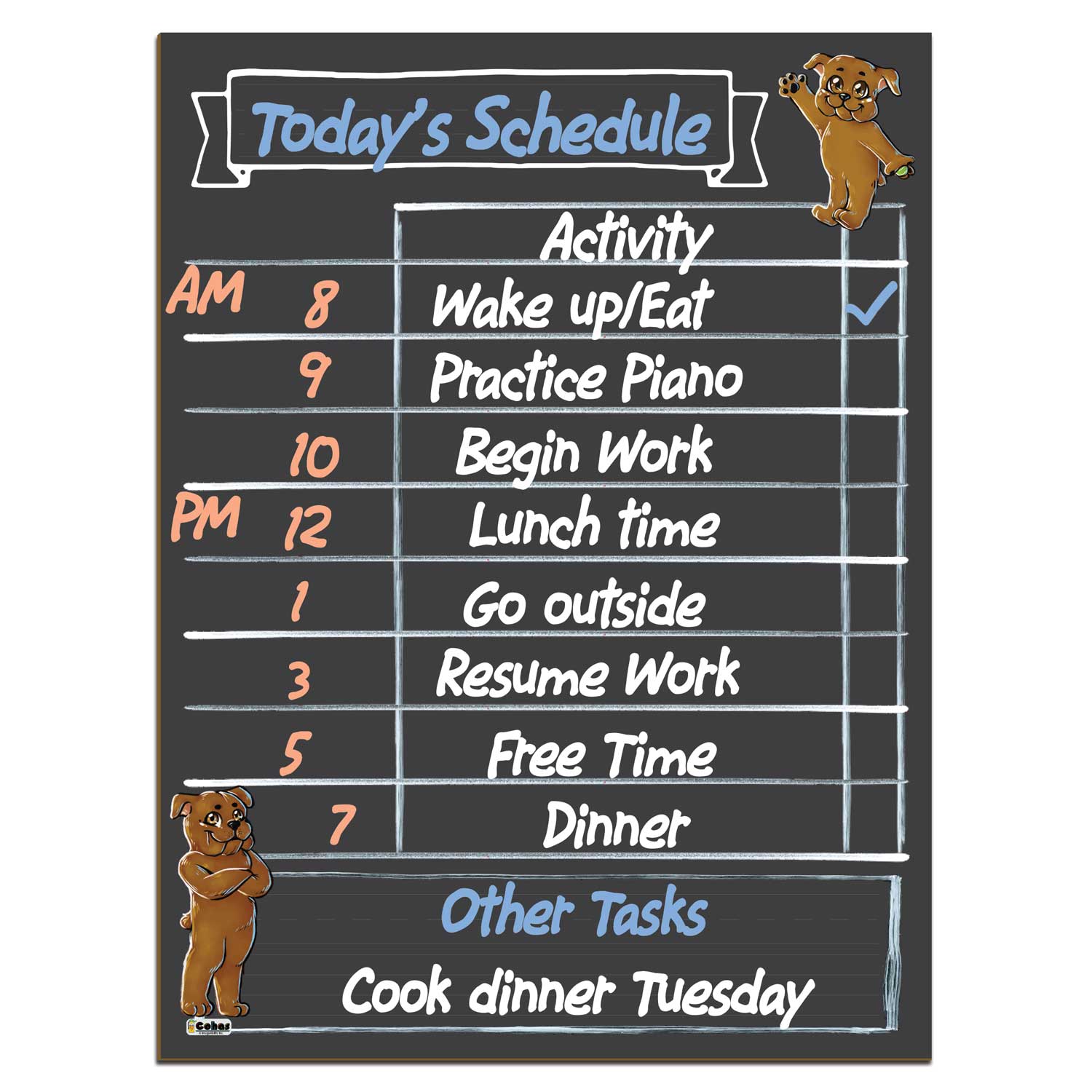Cohas bulldog mascot chalkboard daily planners are easy to clean and reuse when used with the included or recommended markers. Simply use water and a sponge or paper towels to wipe away writing and marks. Boards include a selection of Cohas wet-wipe markers that feature a reversible tip. Use the chisel 6mm end for thick and thin lines, or the 2mm bullet tip for thin even lines. The markers remove easily with water.