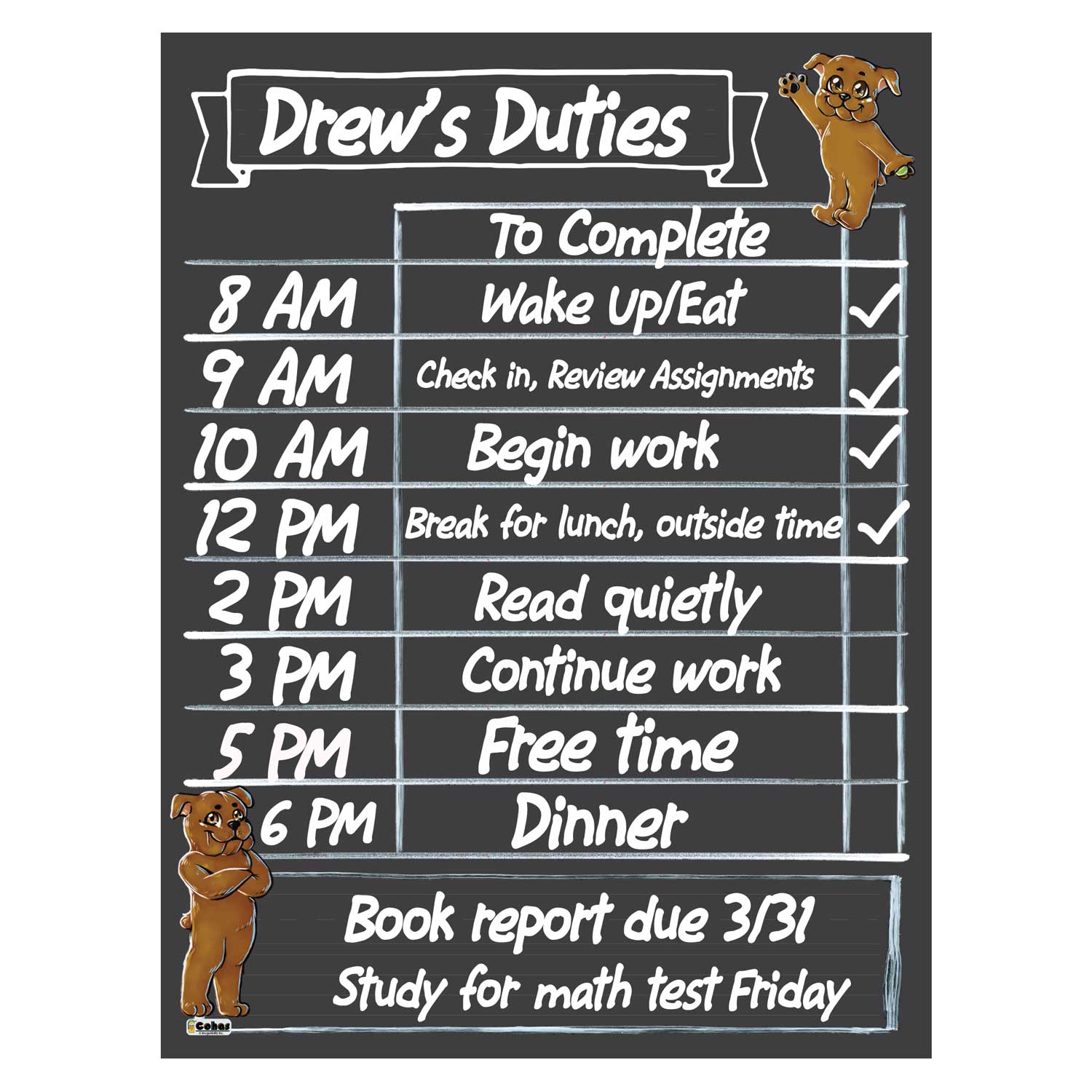 Bulldog mascot magnetic backed daily planners feature a chalkboard style surface on a magnetic backed flexible board that can be hung on a fridge or other metal surface. They are perfect for remote learning and homeschooling schedules each day. The boards feature real chalk artwork; chalk lines and boxes to write and mark complete each task; and a box at the bottom of the chart to write notes, rewards, reminders, and words of encouragement for your family.