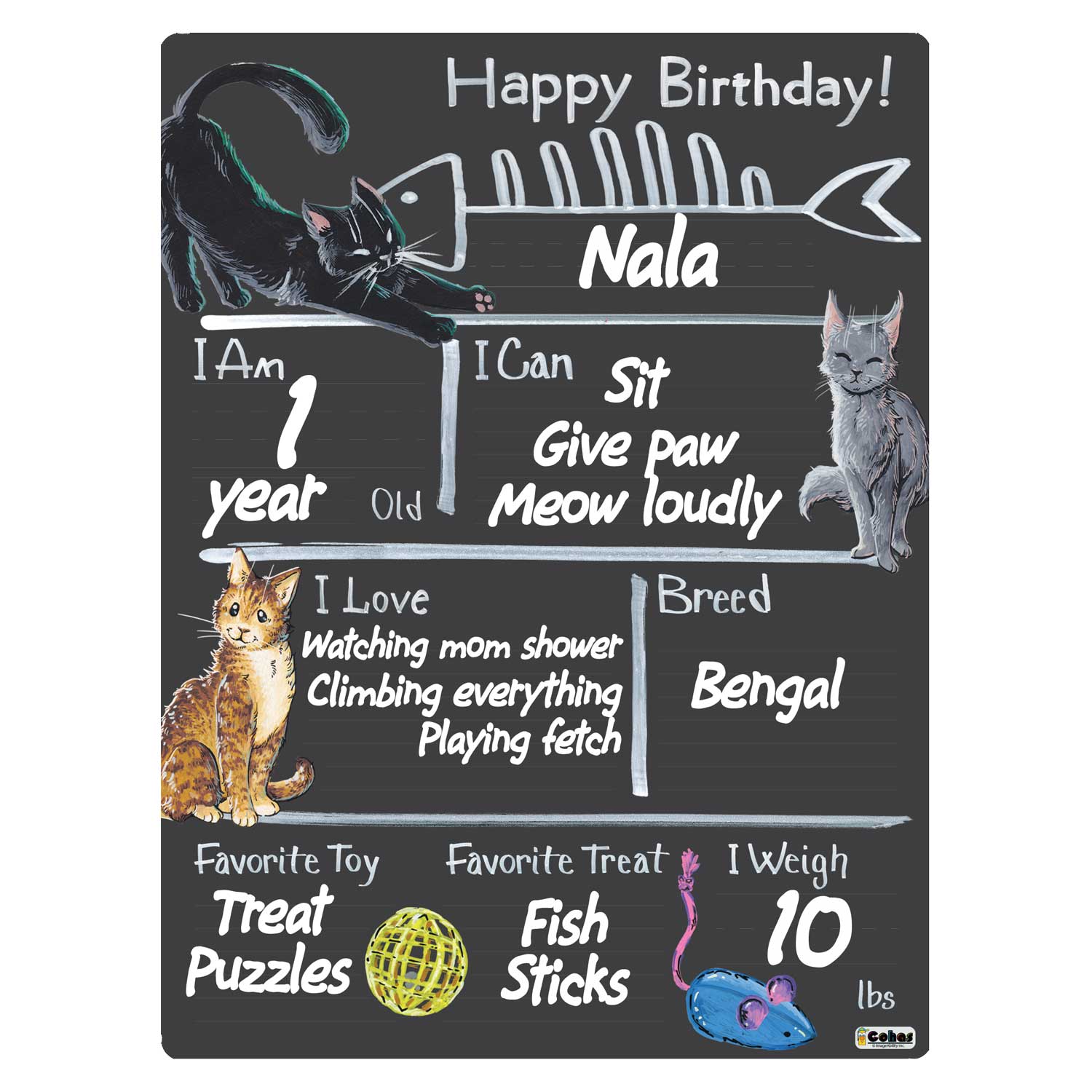 Cohas cat birthday milestone board is easy to clean and reuse when used with the included or recommended markers. Simply use water and a sponge or paper towels to wipe away lettering and designs. Boards that include a marker kit come with Cohas Wet-Wipe Markers. The marker features a reversible 2mm and 6mm tip, perfect for making thick and thin lines. The markers will remove easily with water.