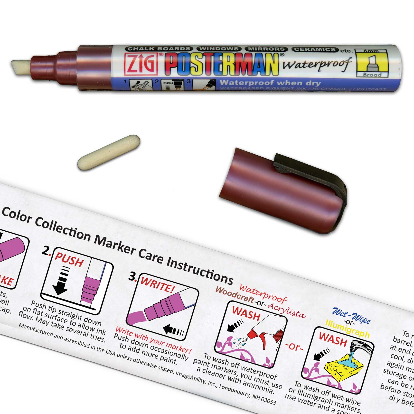 The markers’ waterproof ink means it will not wash off with just water. This makes the markers great for use outdoors, high traffic areas, or on signage and displays that may get exposed to water or moisture. To clean the ink, use a cleaner with ammonia, like Windex or kitchen cleaner. Allow the surface to fully dry before reapplying markers.