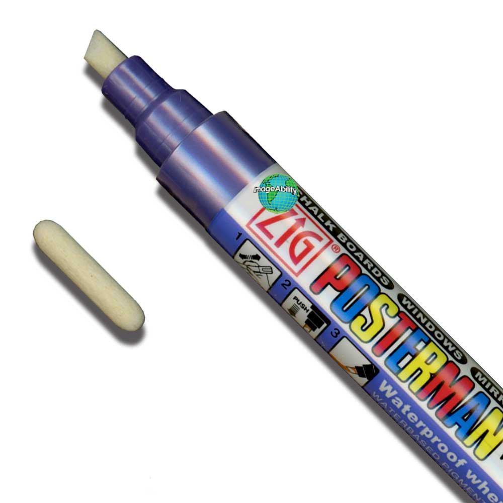 Zig Posterman Waterproof 6mm tip metallic violet marker with 2mm tip features a broad chisel tip marker, as well as a bonus bullet 2mm tip. Switch tip sizes quickly without needing 2 markers on hand! Use the 6mm tip to make thin and thick lines up to 1/4-inches wide. Change to the 2mm rounded tip to make thinner lines up to 1/8-inches wide.