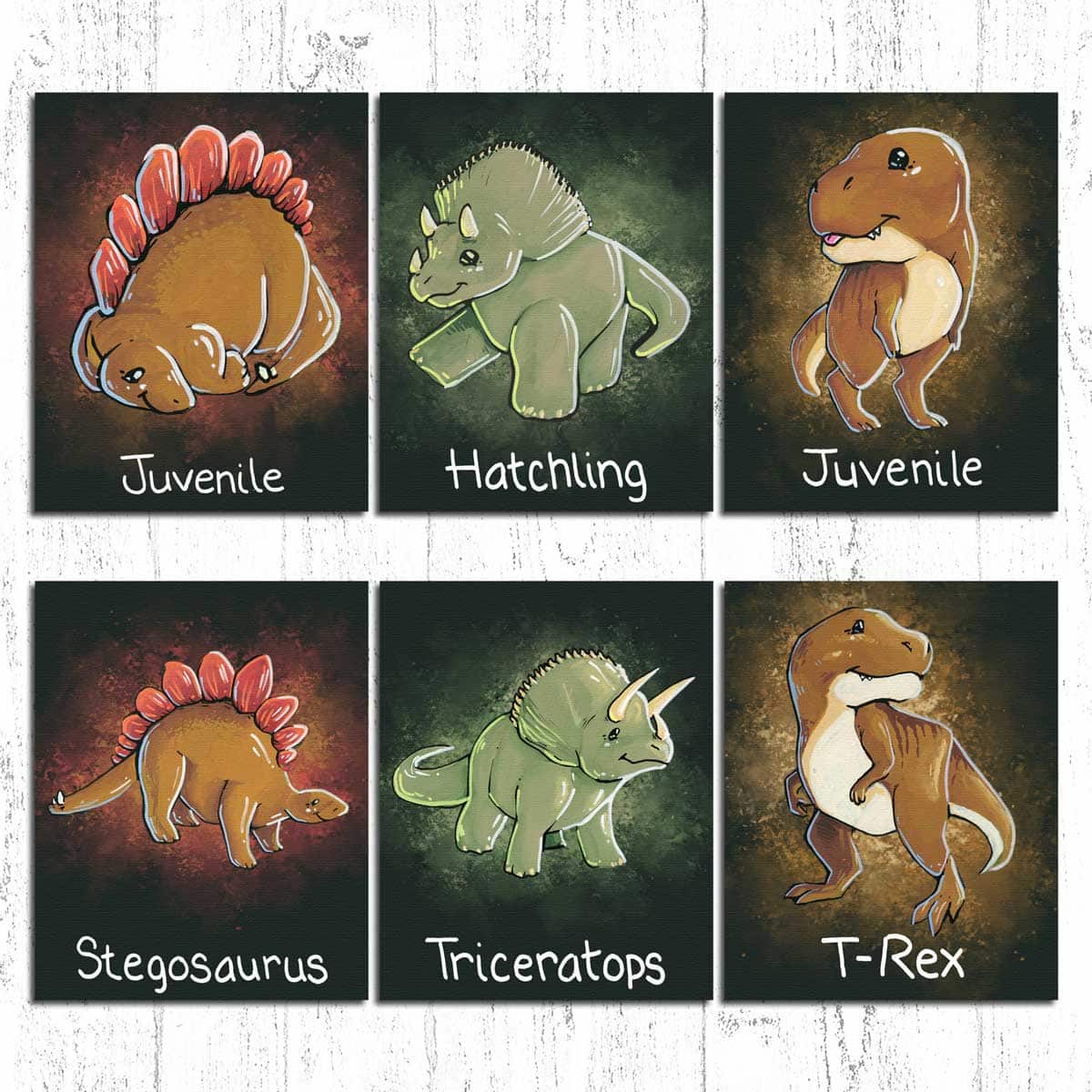 Dinosaur canvas prints feature hand painted chalk artwork on real canvases. They are perfect for hanging in baby’s nursery, bedroom, playroom, or around the house. The prints feature baby and adult dinos on a chalkboard-like background. A splash of color has been added to make the dinosaurs stand out. The type of animal is written in simple chalk lettering, providing a fun learning opportunity for your little one!