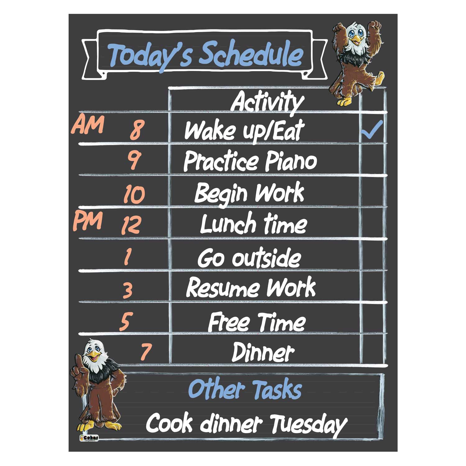 Eagle mascot magnetic backed daily planners feature a chalkboard style surface on a magnetic backed flexible board that can be hung on a fridge or other metal surface. They are perfect for remote learning and homeschooling schedules each day. The boards feature real chalk artwork; chalk lines and boxes to write and mark complete each task; and a box at the bottom of the chart to write notes, rewards, reminders, and words of encouragement for your family.