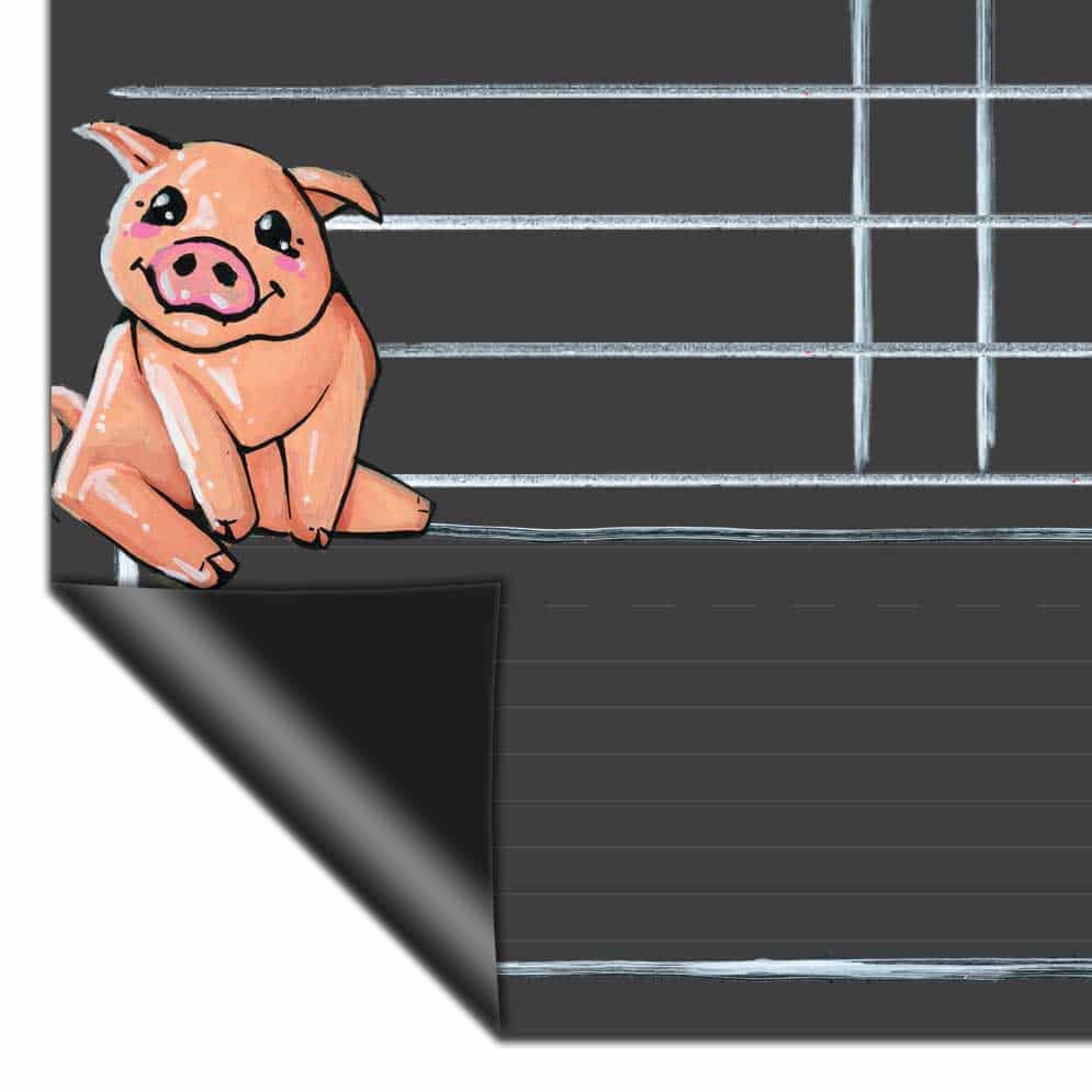Farm animal magnetic backed chore charts feature a chalkboard style surface on a magnetic backed flexible board that can be hung on a fridge or other metal surface. They are perfect for tracking your family’s responsibilities and rewards each week. The boards feature real chalk artwork; chalk lines and boxes to write and mark complete each task; and a box at the bottom of the chart to write notes, rewards, reminders, and words of encouragement for your family.
