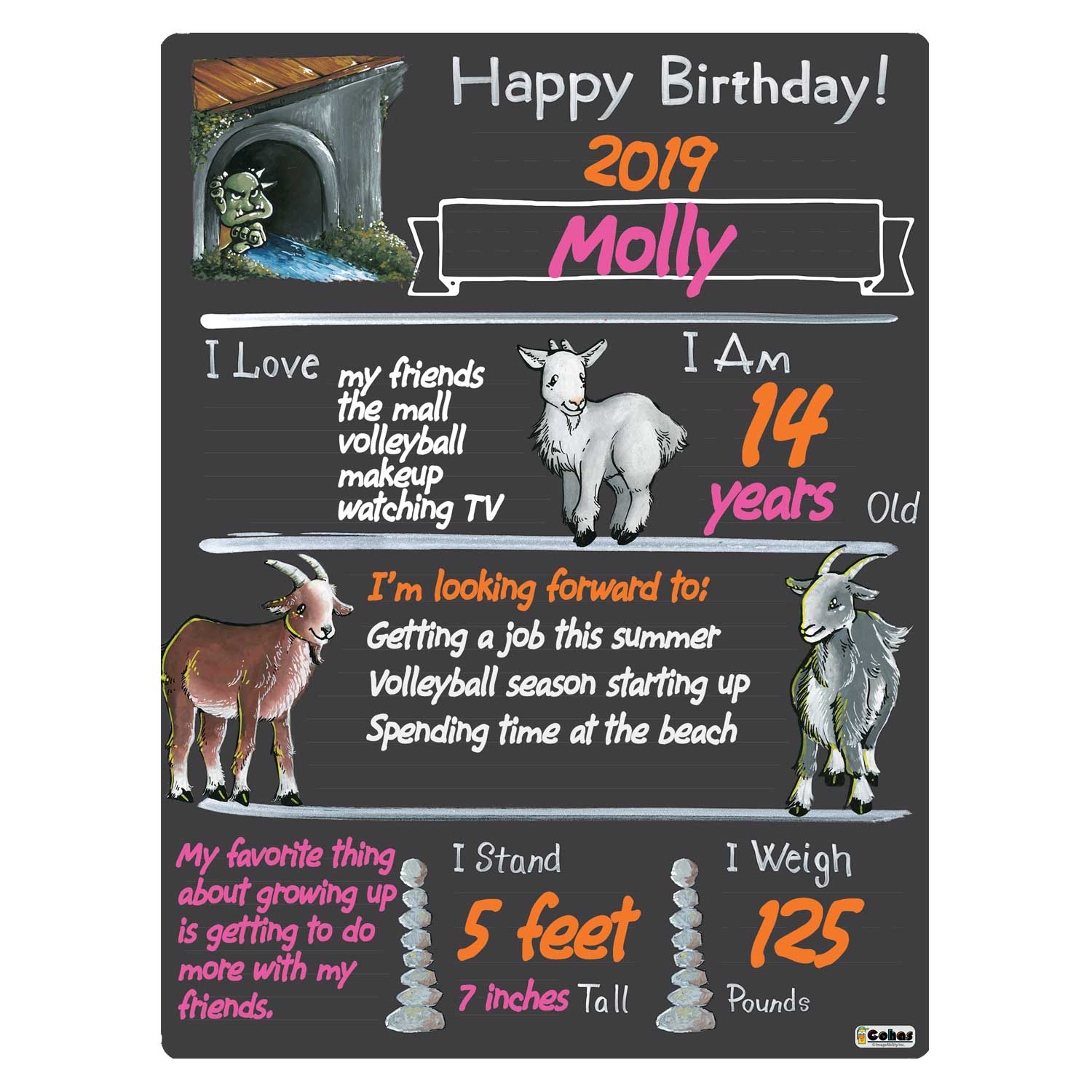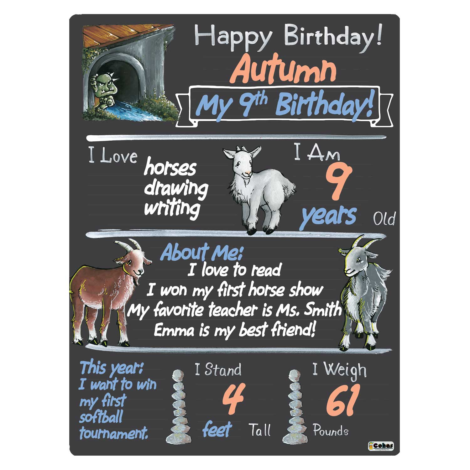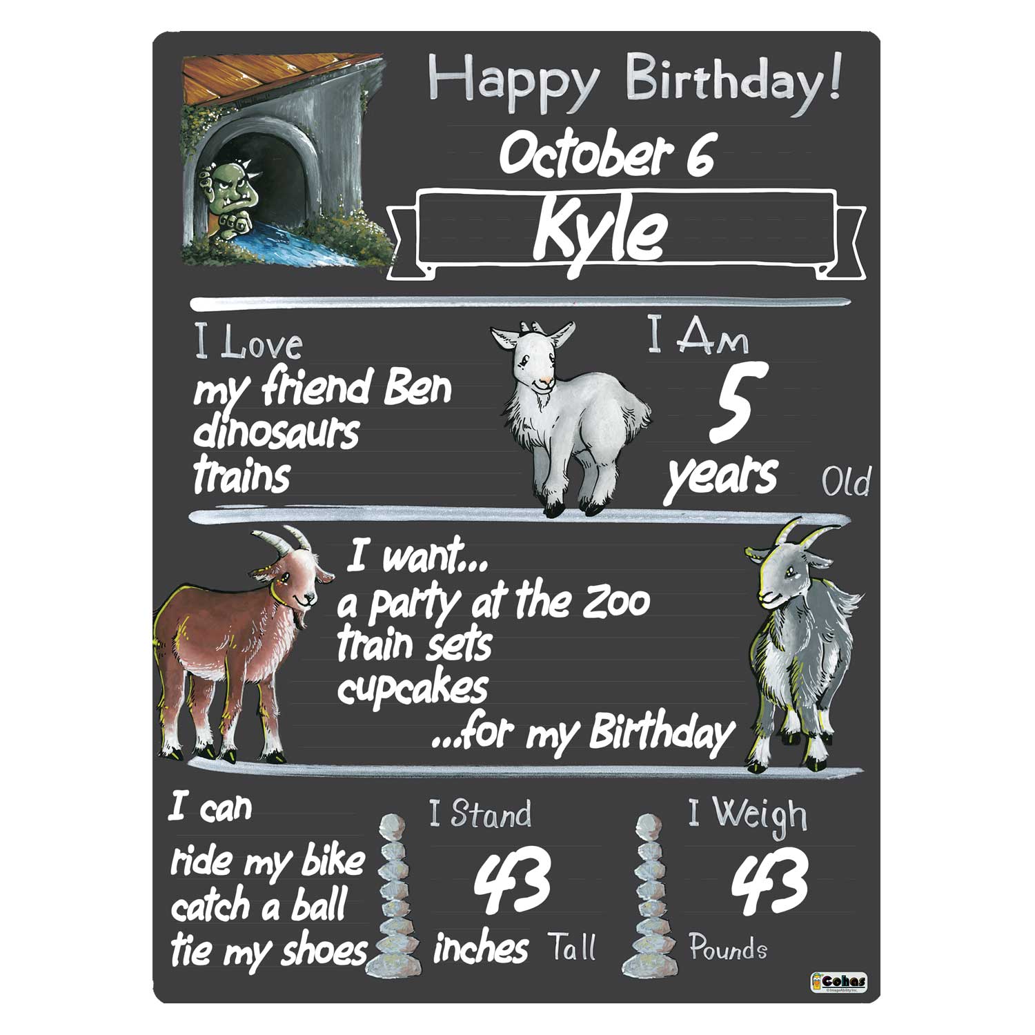 Goat theme birthday milestone boards feature a chalkboard-style surface and real chalk artwork. They are perfect for capturing memories and watching your children grow year after year. The boards feature faint guidelines, to ensure writing is neat and straight; a matte finish, to reduce glare from cameras and lighting; and round, smooth corners, to prevent scratching or scraping little fingers.