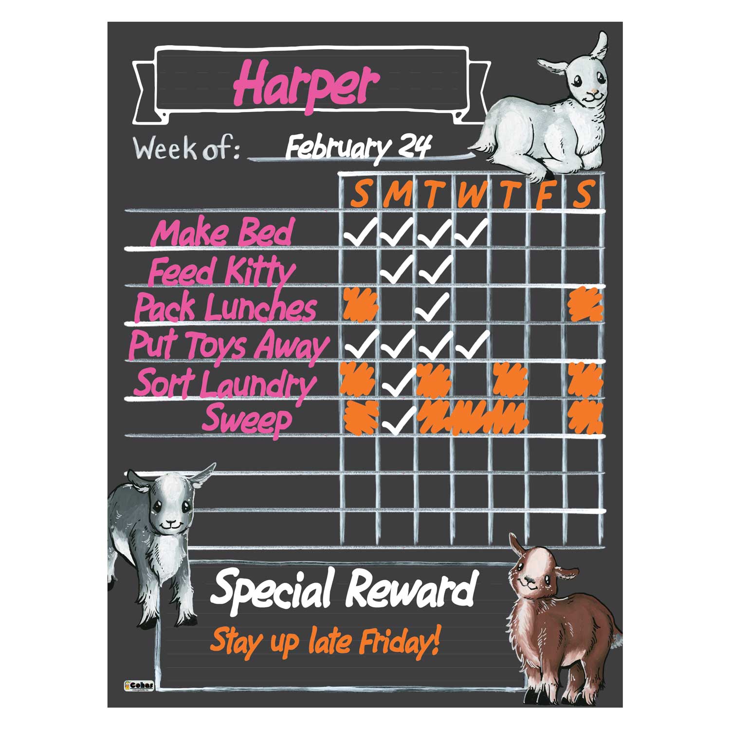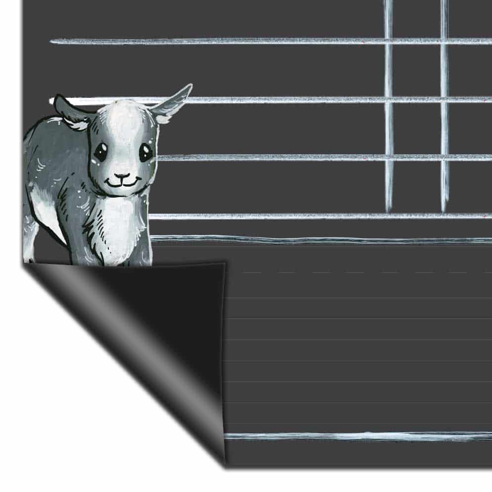 Goat magnetic backed chore charts feature a chalkboard style surface on a magnetic backed flexible board that can be hung on a fridge or other metal surface. They are perfect for tracking your family’s responsibilities and rewards each week. The boards feature real chalk artwork; chalk lines and boxes to write and mark complete each task; and a box at the bottom of the chart to write notes, rewards, reminders, and words of encouragement for your family.