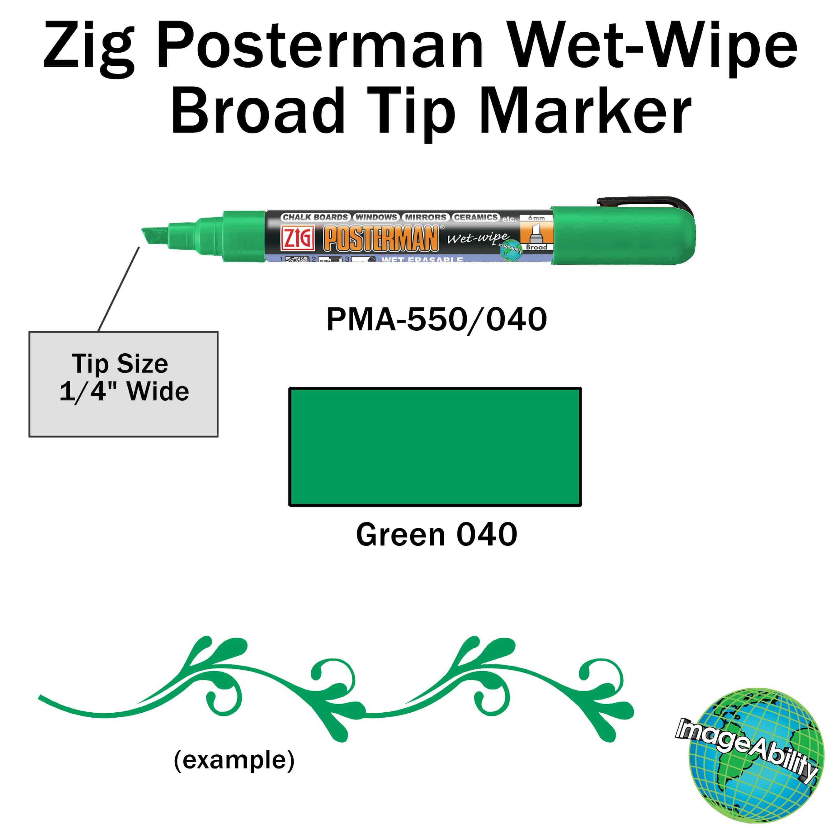 Green wet-wipe broad chisel 6mm tip marker features a chisel tip for making thin and thick lines. They provide customers a quality liquid chalk ink that is highly opaque. The markers can be used on a variety of surfaces, like Cohas products, classic chalkboards, glass, plastic and more. They are perfect for use adding lettering and decorative art to nonporous surfaces.