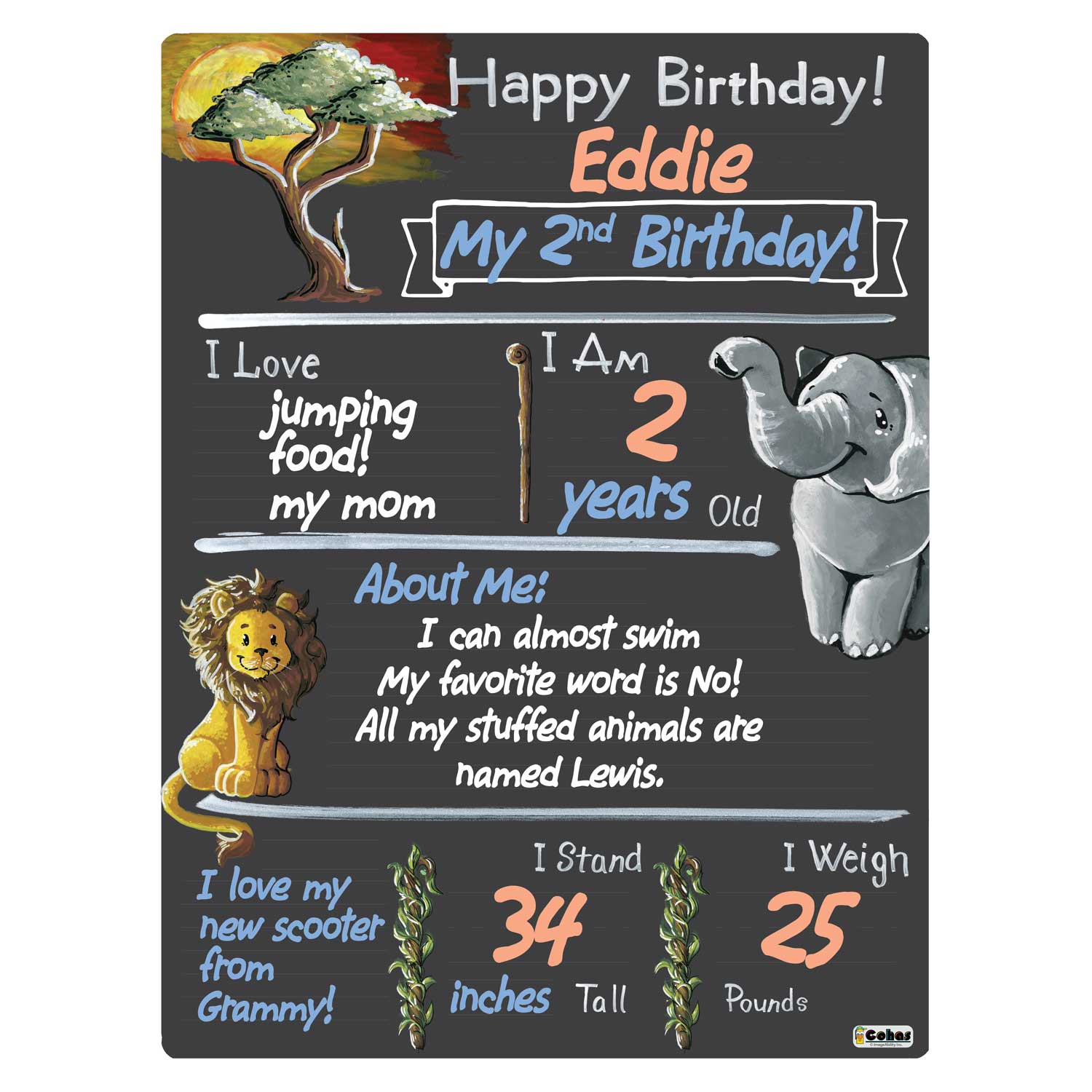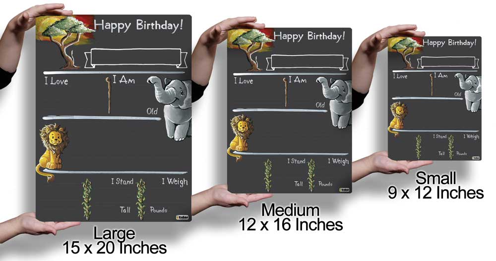Jungle theme birthday milestone boards feature a chalkboard-style surface and real chalk artwork. They are perfect for capturing memories and watching your children grow year after year. The boards feature faint guidelines, to ensure writing is neat and straight; a matte finish, to reduce glare from cameras and lighting; and round, smooth corners, to prevent scratching or scraping little fingers.
