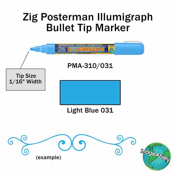 Light blue Illumigraph medium bullet 2mm tip marker features a medium tip for making thin lines. They provide customers a quality liquid chalk ink that is highly fluorescent and opaque. The markers can be used on a variety of surfaces, like Cohas products, classic chalkboards, glass, plastic and more. They are perfect for use adding lettering and decorative art to nonporous surfaces.
