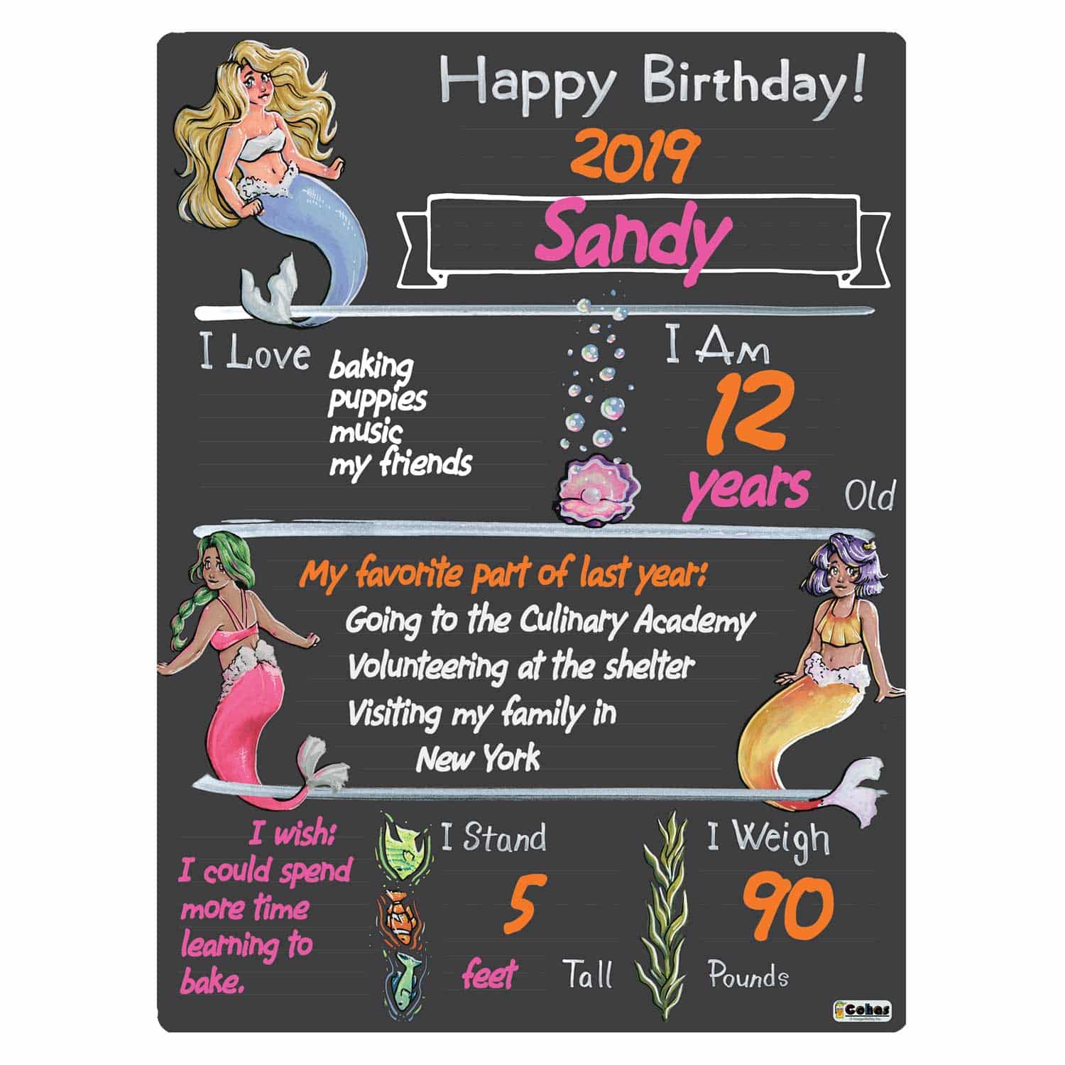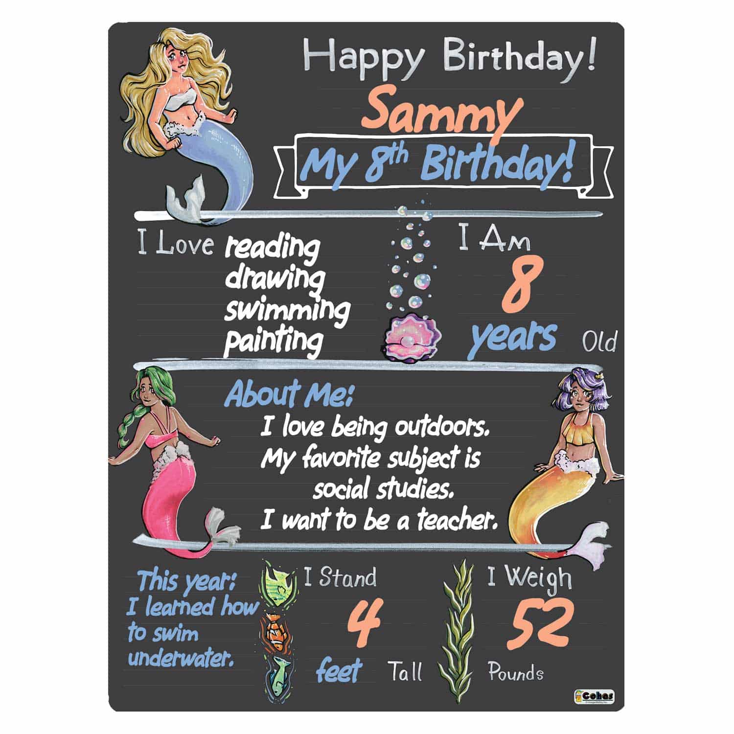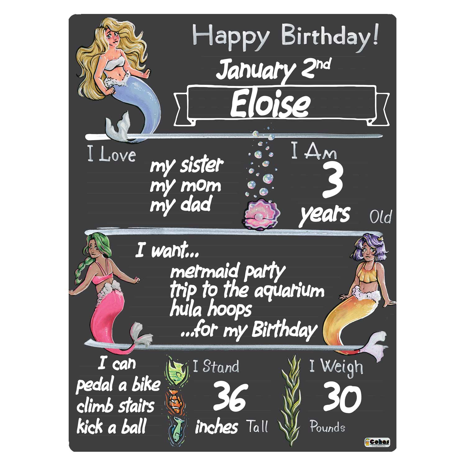 Mermaid theme birthday milestone boards feature a chalkboard-style surface and real chalk artwork. They are perfect for capturing memories and watching your children grow year after year. The boards feature faint guidelines, to ensure writing is neat and straight; a matte finish, to reduce glare from cameras and lighting; and round, smooth corners, to prevent scratching or scraping little fingers.