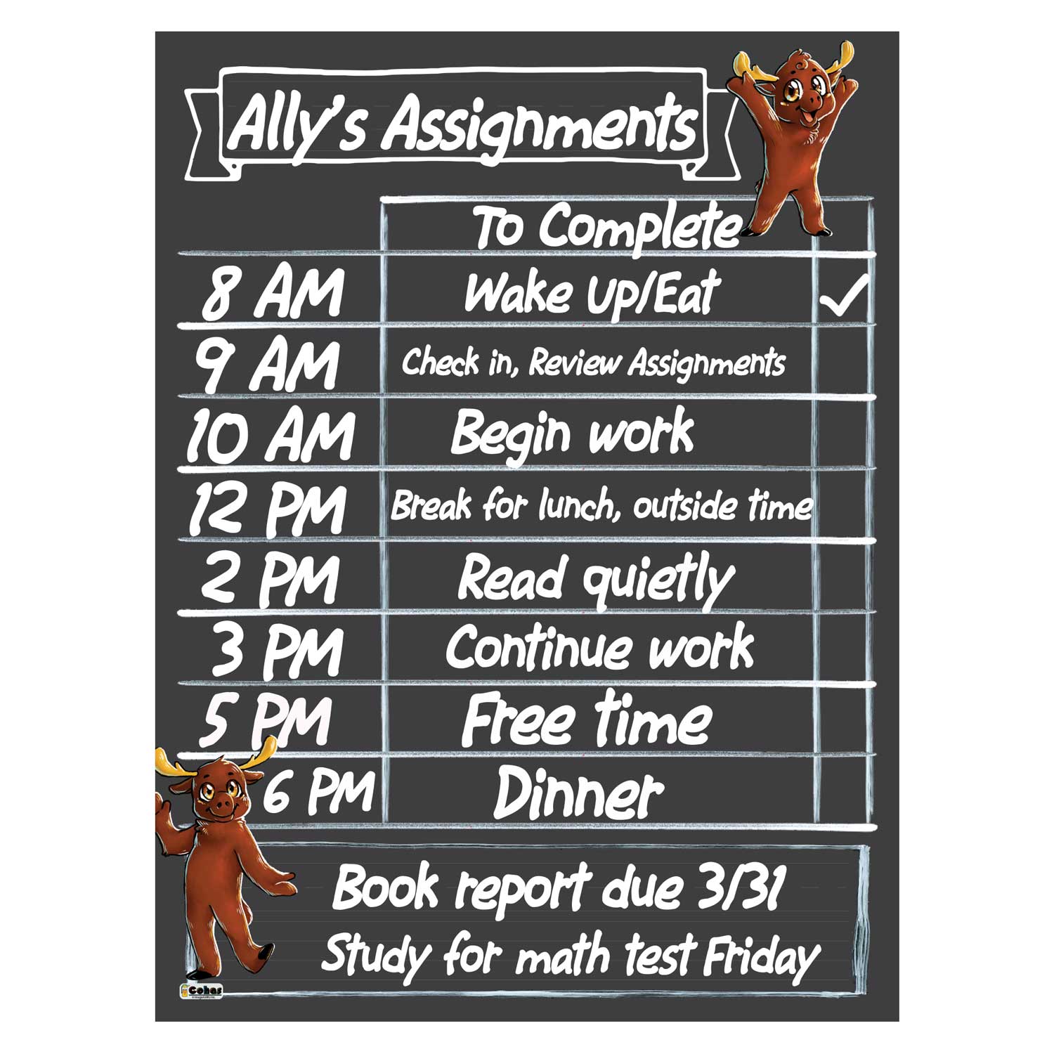 Moose mascot magnetic backed daily planners feature a chalkboard style surface on a magnetic backed flexible board that can be hung on a fridge or other metal surface. They are perfect for remote learning and homeschooling schedules each day. The boards feature real chalk artwork; chalk lines and boxes to write and mark complete each task; and a box at the bottom of the chart to write notes, rewards, reminders, and words of encouragement for your family.