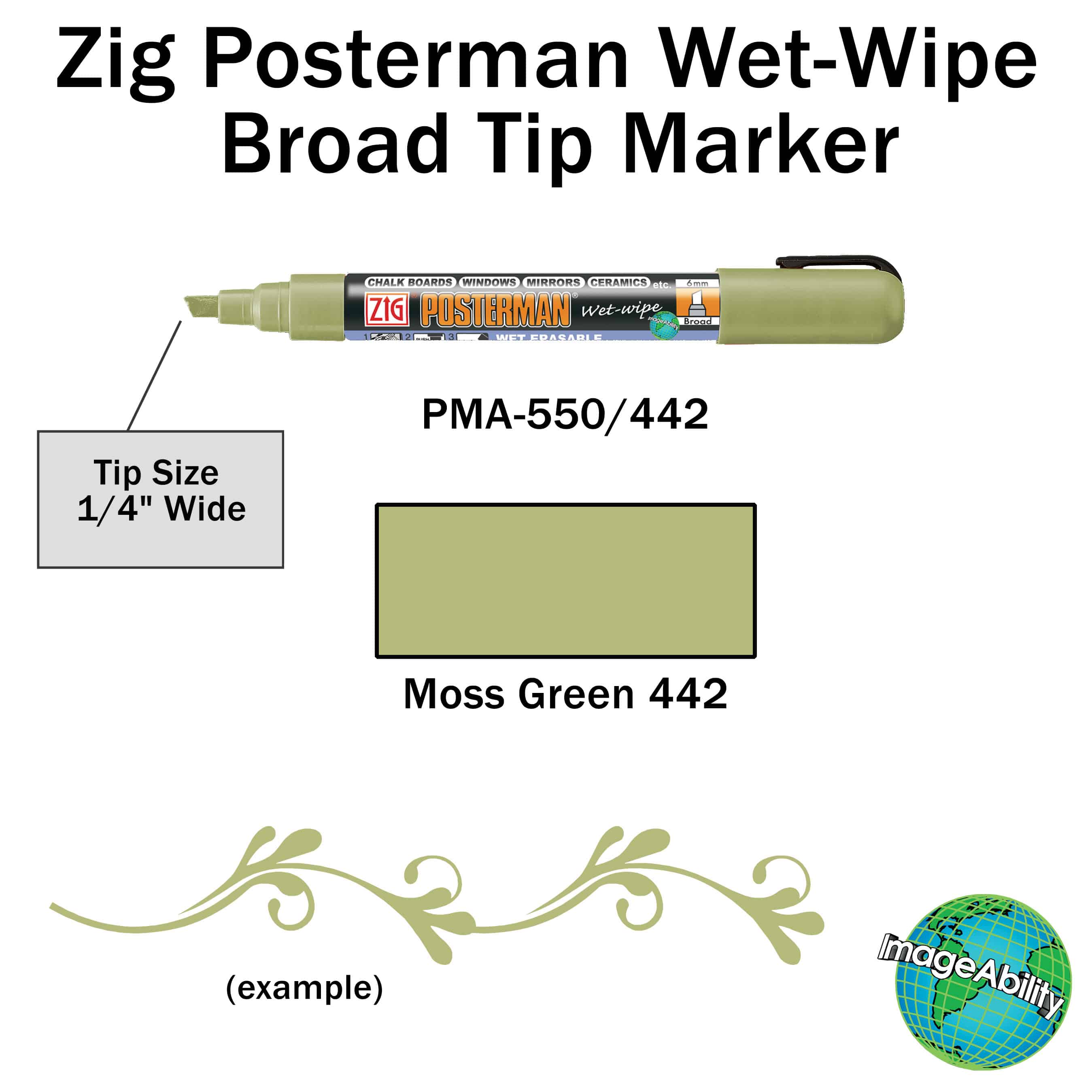 Moss green wet-wipe broad chisel 6mm tip marker features a chisel tip for making thin and thick lines. They provide customers a quality liquid chalk ink that is highly opaque. The markers can be used on a variety of surfaces, like Cohas products, classic chalkboards, glass, plastic and more. They are perfect for use adding lettering and decorative art to nonporous surfaces.