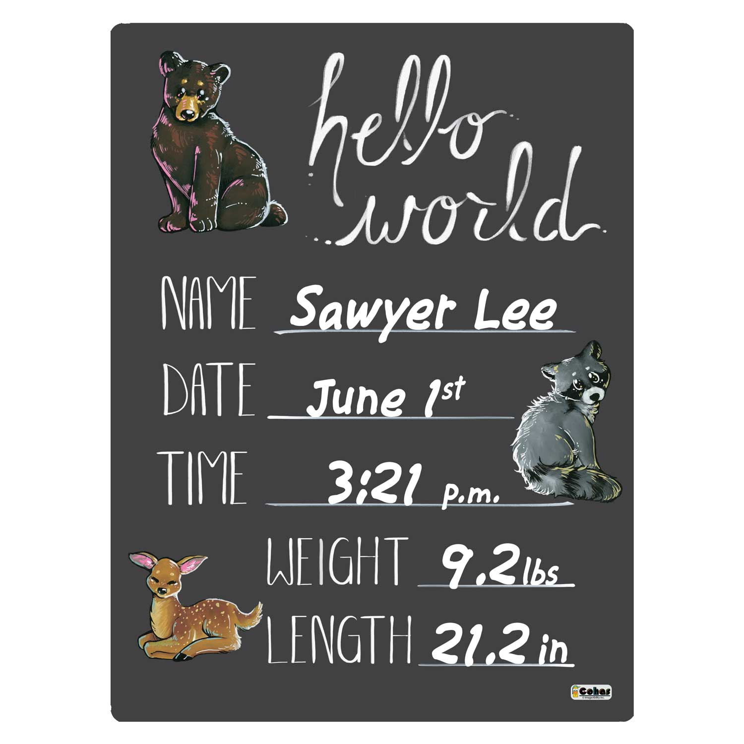 Cohas mountain theme newborn baby announcement chalkboards are easy to use. Simply write your child’s name, birth date, and relevant birth information and allow to dry. Once the photo shoot is over, use the birth announcement board as a keepsake by hanging or framing. Some marker inks can be removed so the board can be used again. To reuse, remove marker ink from board immediately for best results. Use water or gentle cleanser to remove the ink. Do not use abrasive cleaners or magic erasers; they will damage the board’s surface. Chalk will not work on the board.