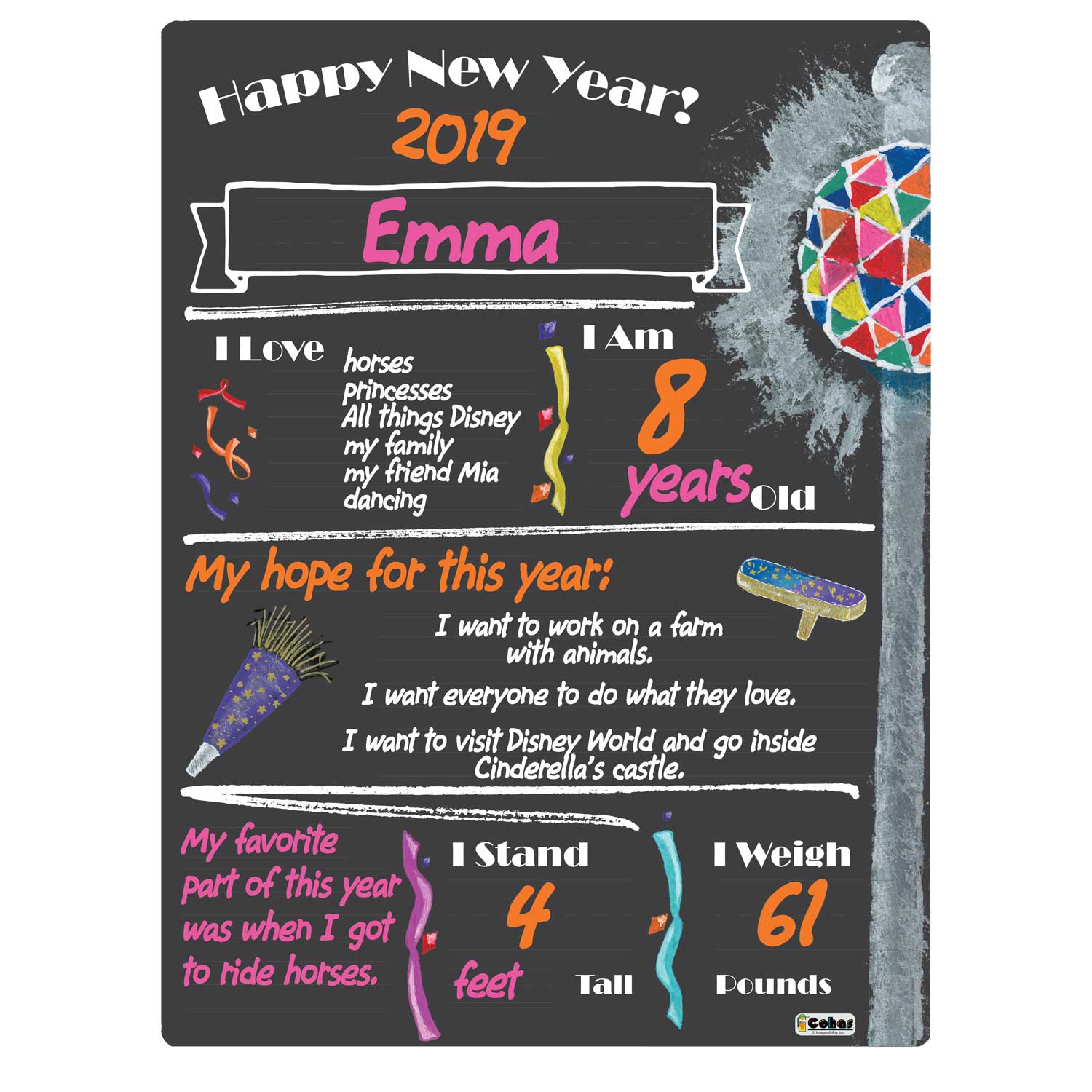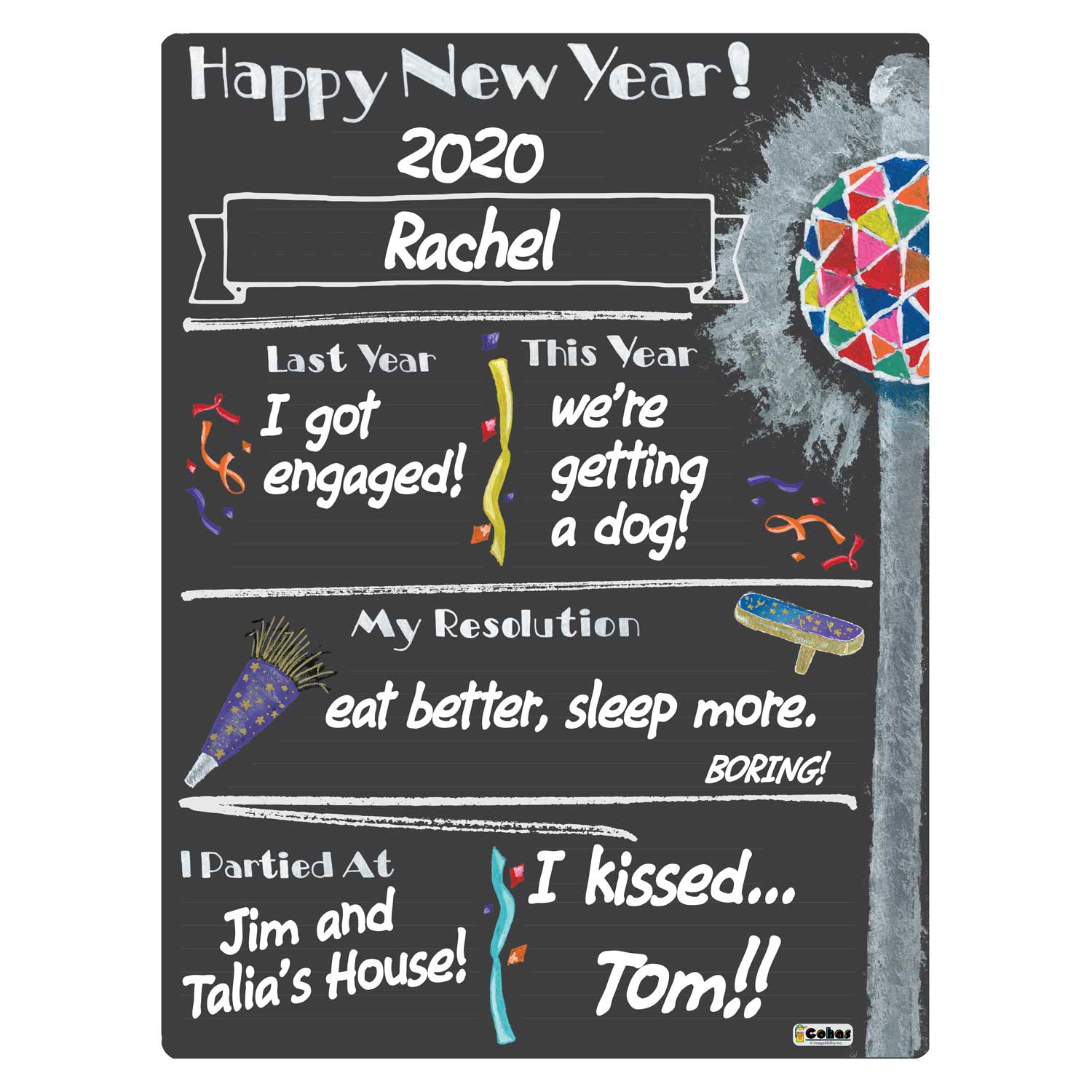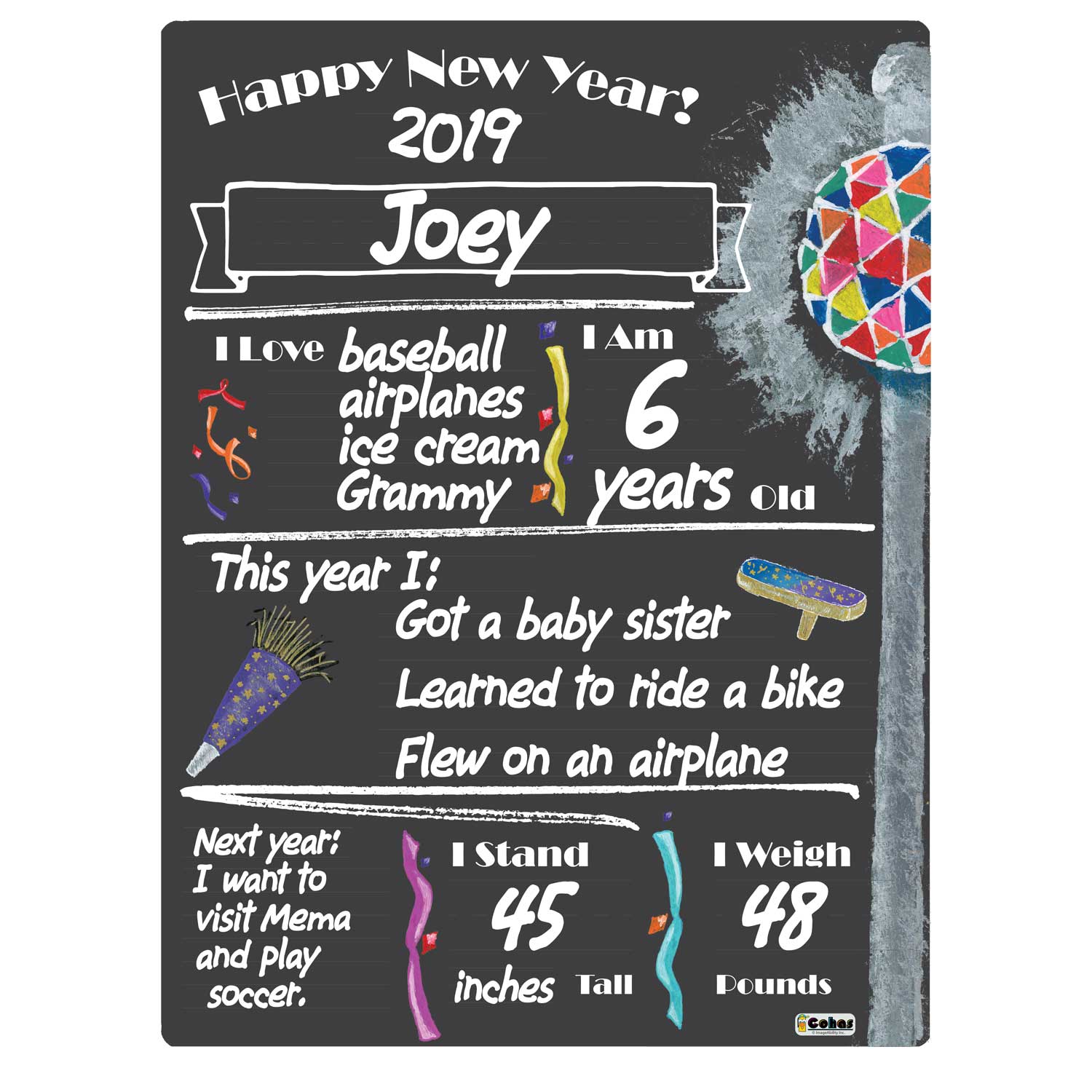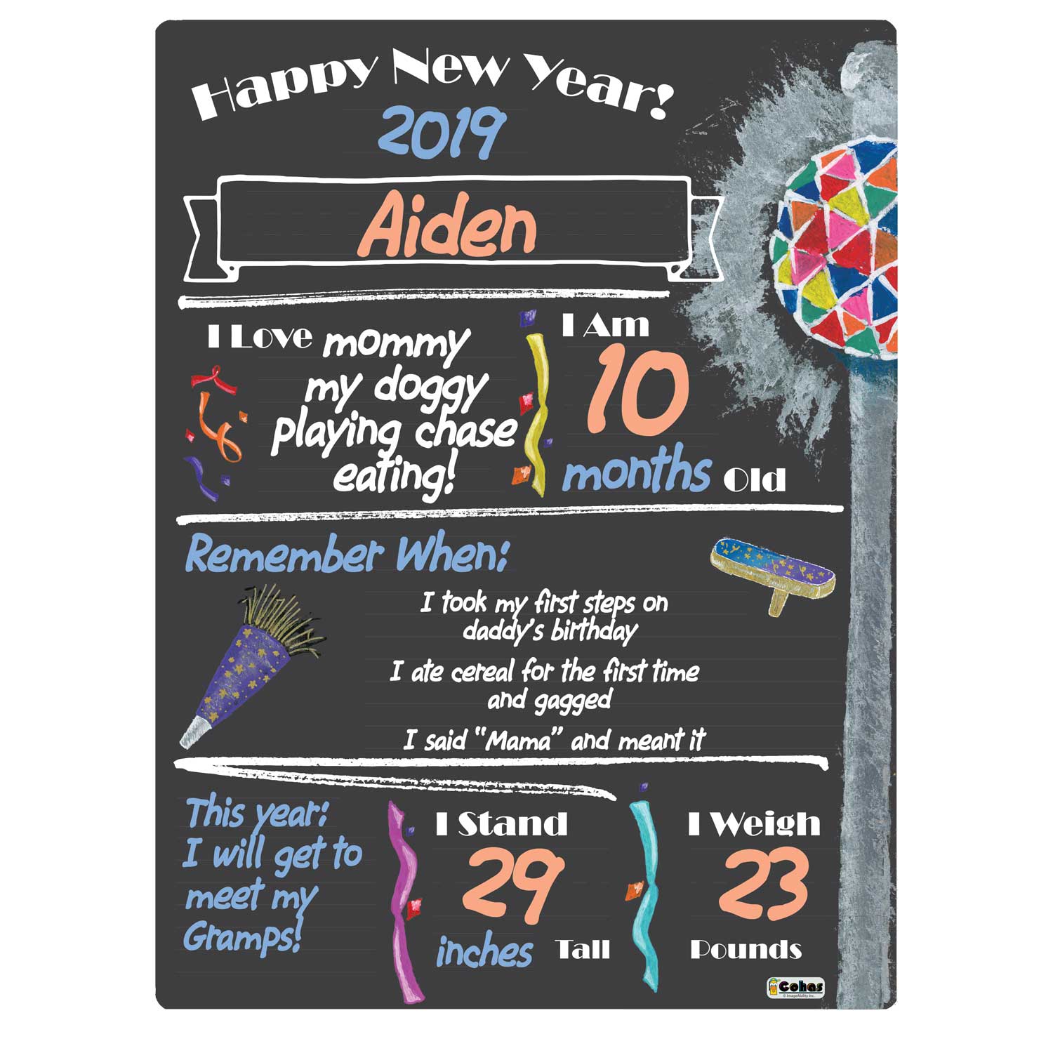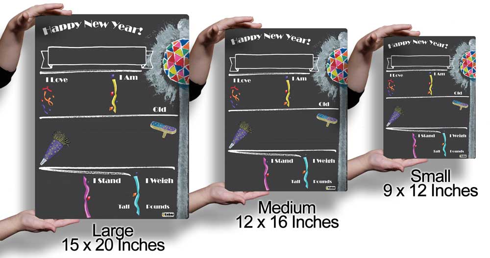 New Years Eve theme milestone boards feature a chalkboard-style surface and real chalk artwork. They are perfect for capturing memories and watching your children grow year after year. The boards feature faint guidelines, to ensure writing is neat and straight; a matte finish, to reduce glare from cameras and lighting; and round, smooth corners, to prevent scratching or scraping little fingers.