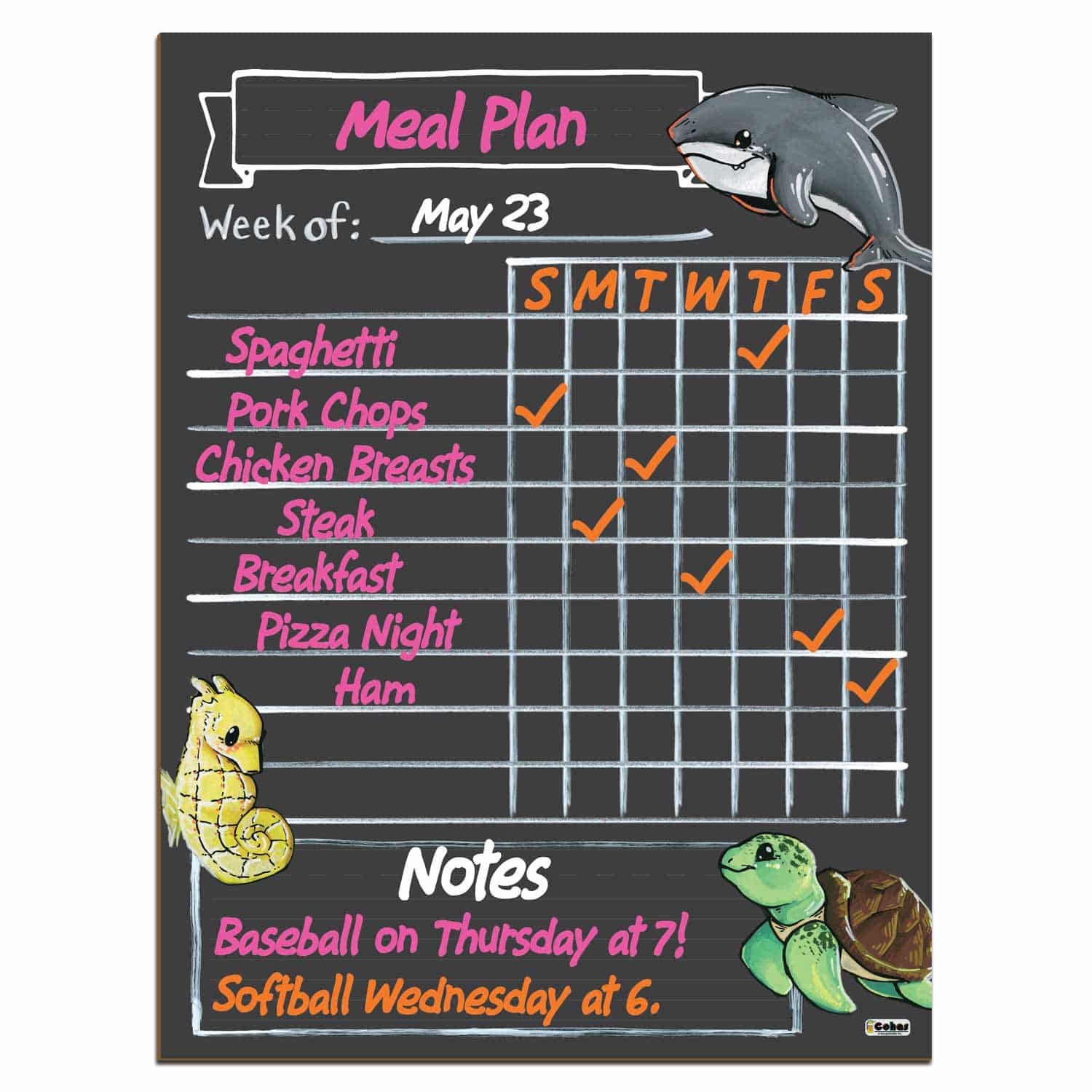 Ocean animal chalkboard chore charts feature a chalkboard style surface mounted to a hardboard that can be hung on the wall. They are perfect for tracking your family’s responsibilities and rewards each week. The boards feature real chalk artwork; chalk lines and boxes to write and mark complete each task; and a box at the bottom of the chart to write notes, rewards, reminders, and words of encouragement for your family.