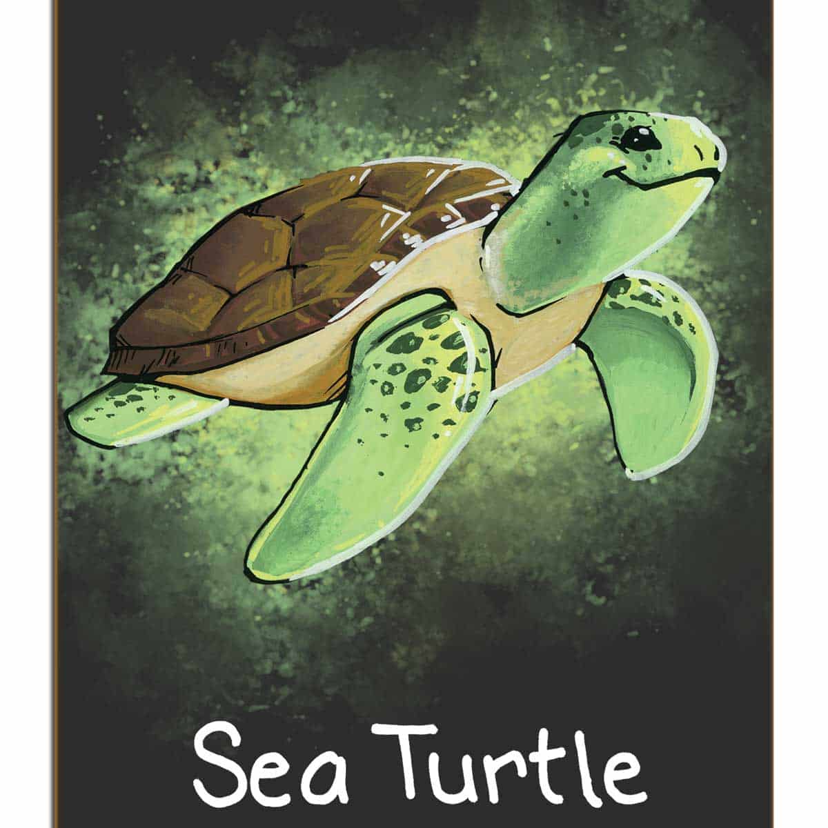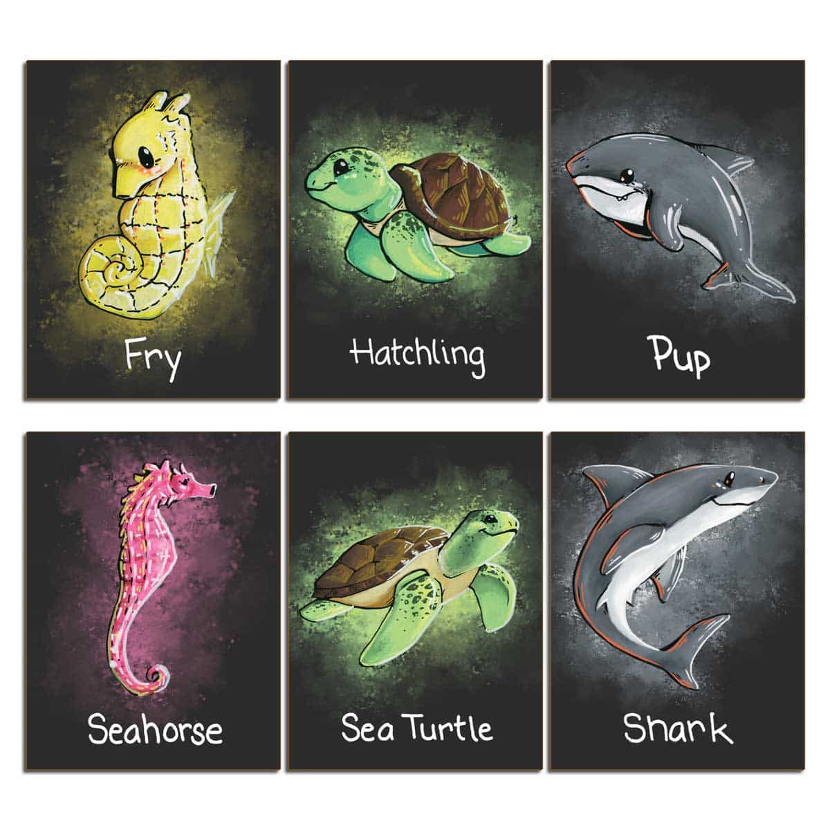 Ocean animal frame-ready prints feature hand painted chalk artwork on a solid board. They are perfect for hanging in baby’s nursery, bedroom, playroom, or around the house. The prints feature baby and adult animals on a chalkboard-like background. A splash of color has been added to make the animals stand out. The type of animal is written in simple chalk lettering, providing a fun learning opportunity for your little one!