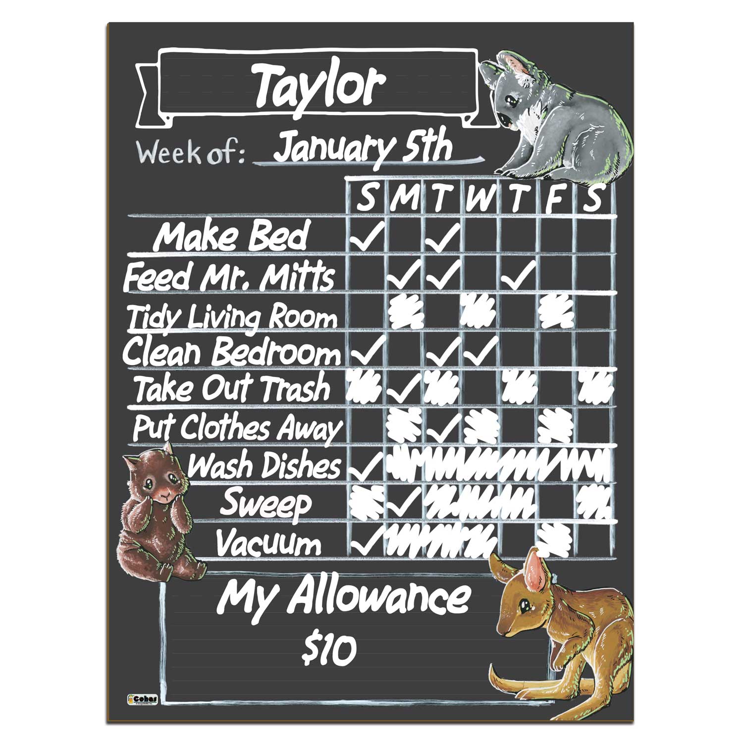 Cohas outback animal chalkboard chore charts are easy to clean and reuse when used with the included or recommended markers. Simply use water and a sponge or paper towels to wipe away writing and marks. Boards include a selection of Cohas wet-wipe markers that feature a reversible tip. Use the chisel 6mm end for thick and thin lines, or the 2mm bullet tip for thin even lines. The markers remove easily with water.