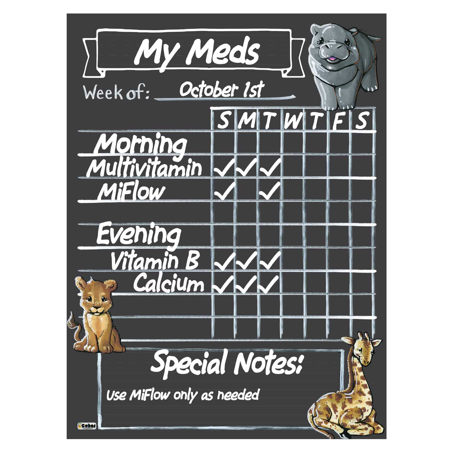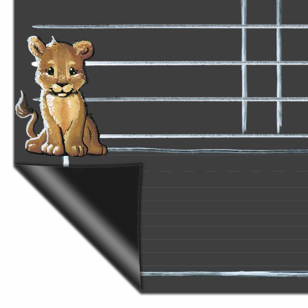 Safari animal magnetic backed chore charts feature a chalkboard style surface on a magnetic backed flexible board that can be hung on a fridge or other metal surface. They are perfect for tracking your family’s responsibilities and rewards each week. The boards feature real chalk artwork; chalk lines and boxes to write and mark complete each task; and a box at the bottom of the chart to write notes, rewards, reminders, and words of encouragement for your family.