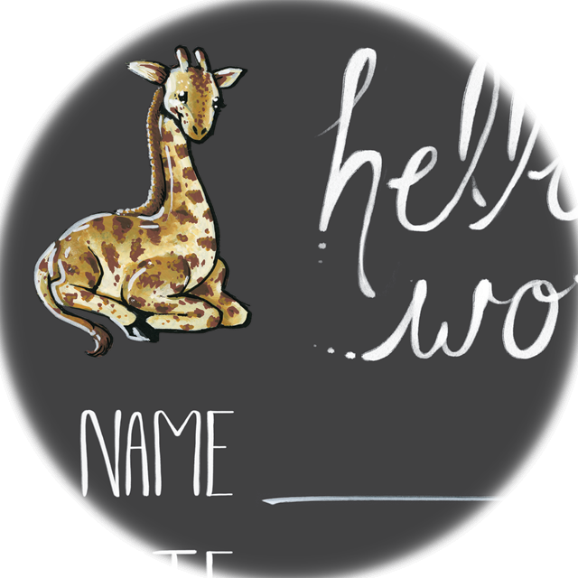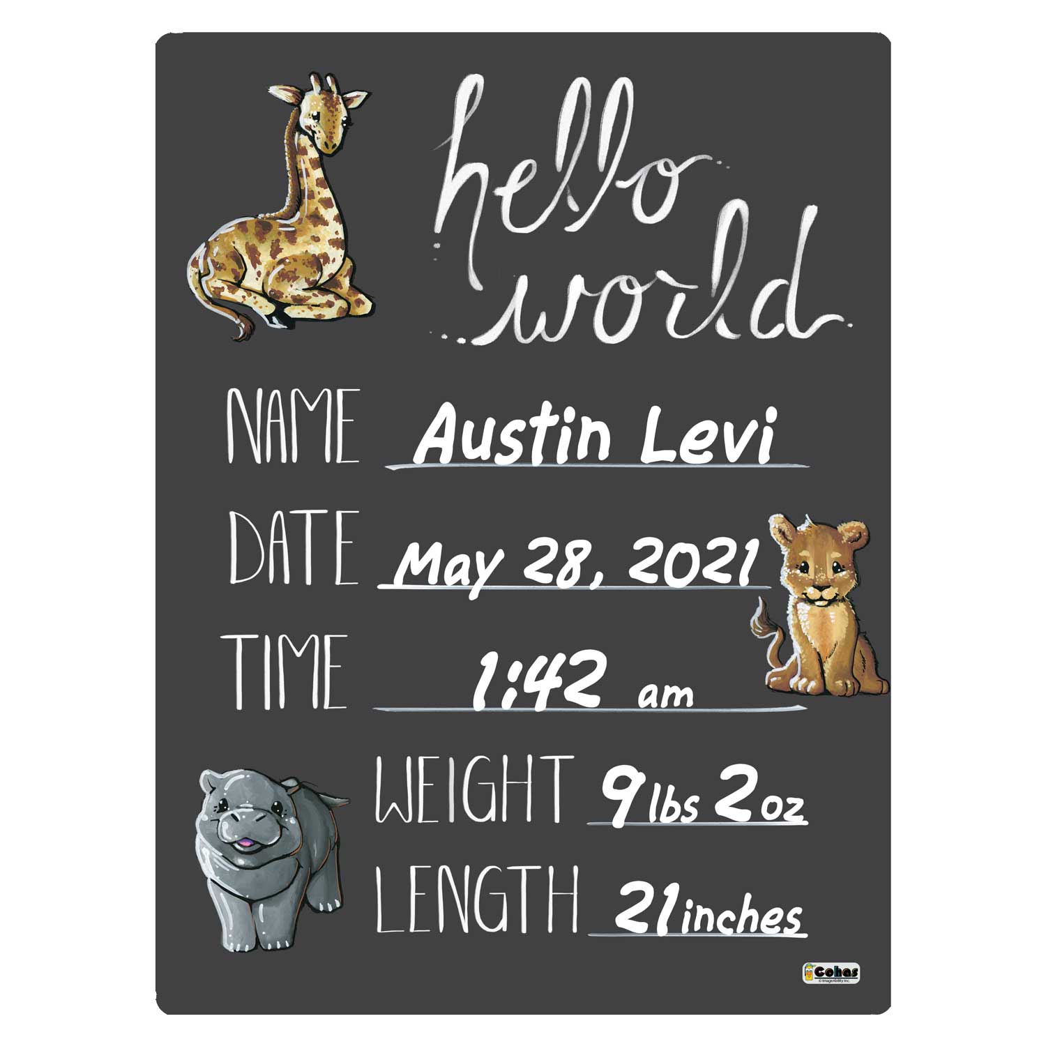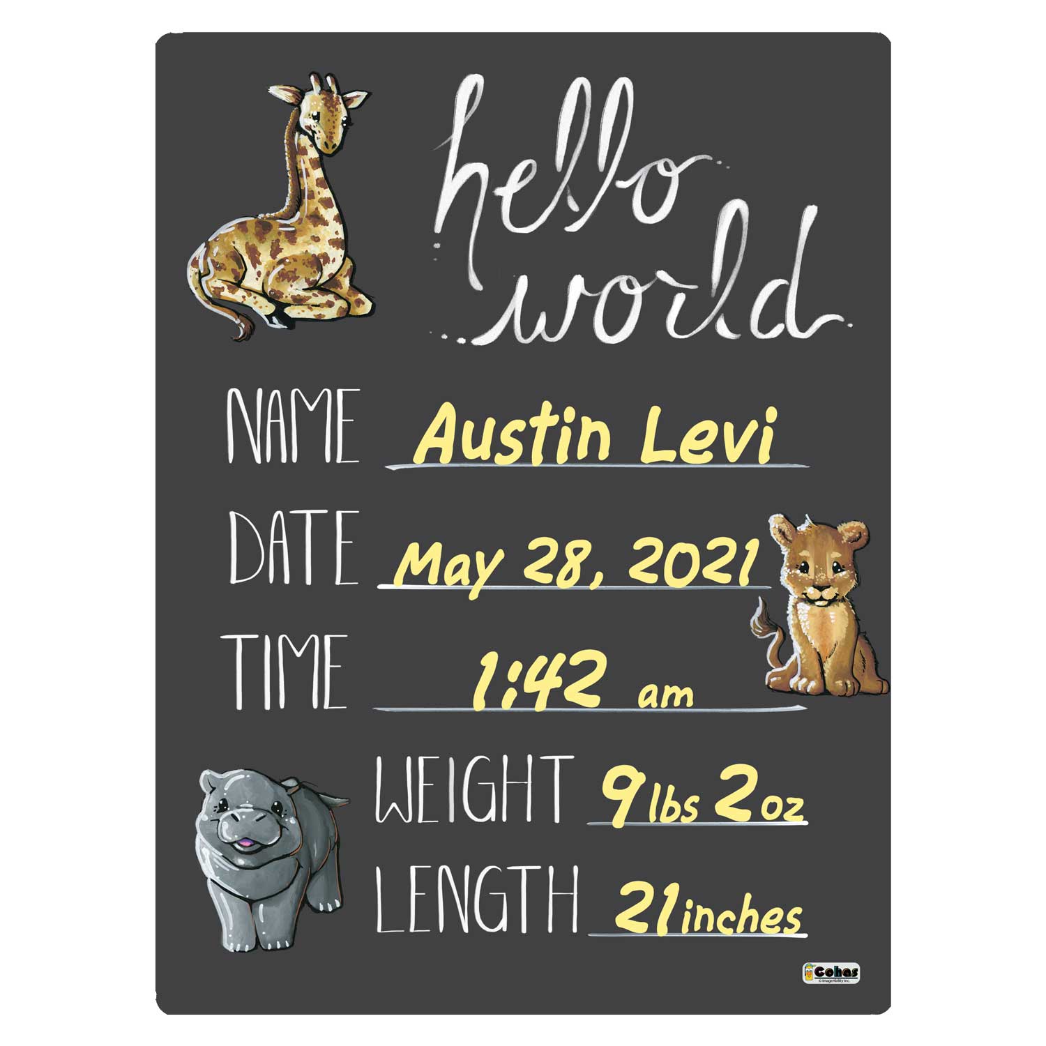 Cohas safari theme newborn baby announcement chalkboards are easy to use. Simply write your child’s name, birth date, and relevant birth information and allow to dry. Once the photo shoot is over, use the birth announcement board as a keepsake by hanging or framing. Some marker inks can be removed so the board can be used again. To reuse, remove marker ink from board immediately for best results. Use water or gentle cleanser to remove the ink. Do not use abrasive cleaners or magic erasers; they will damage the board’s surface. Chalk will not work on the board.