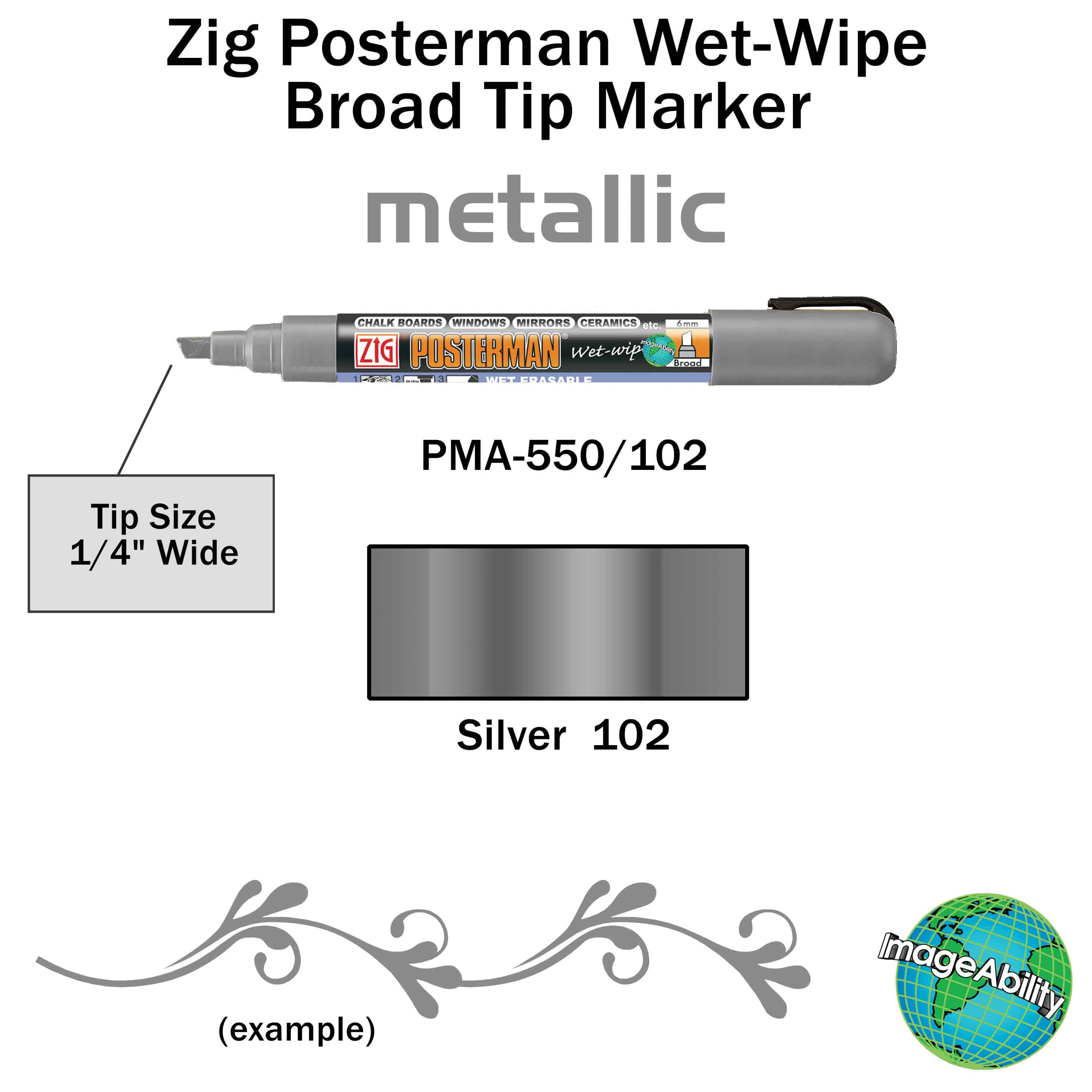 Silver wet-wipe broad chisel 6mm tip marker features a chisel tip for making thin and thick lines. They provide customers a quality liquid chalk ink that is highly opaque. The markers can be used on a variety of surfaces, like Cohas products, classic chalkboards, glass, plastic and more. They are perfect for use adding lettering and decorative art to nonporous surfaces.