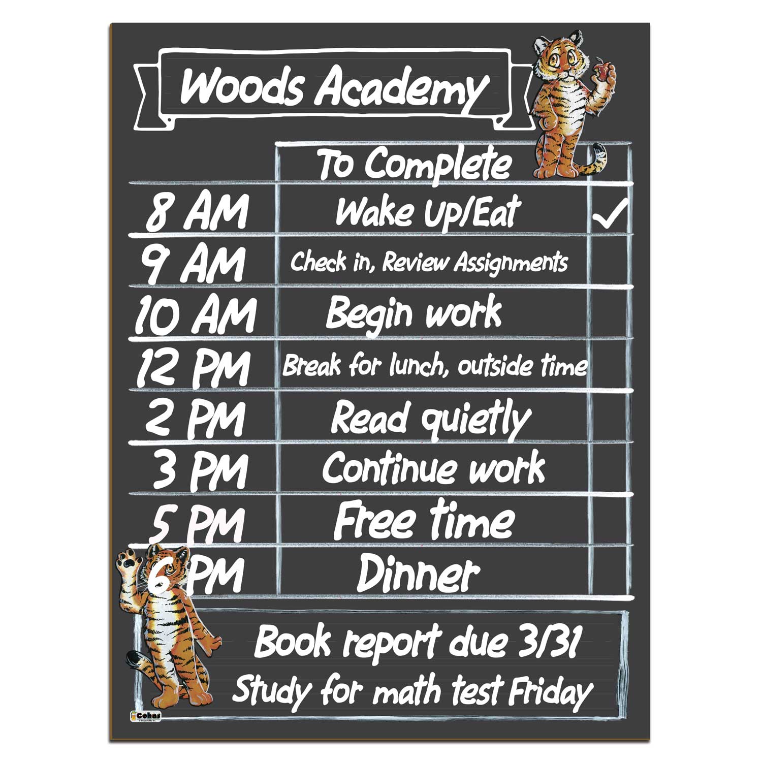 Tiger mascot chalkboard daily planners feature a chalkboard style surface mounted to a hardboard that can be hung on the wall. They are perfect for remote learning and homeschooling schedules each day. The boards feature real chalk artwork; chalk lines and boxes to write and mark complete each task; and a box at the bottom of the chart to write notes, rewards, reminders, and words of encouragement for your family.