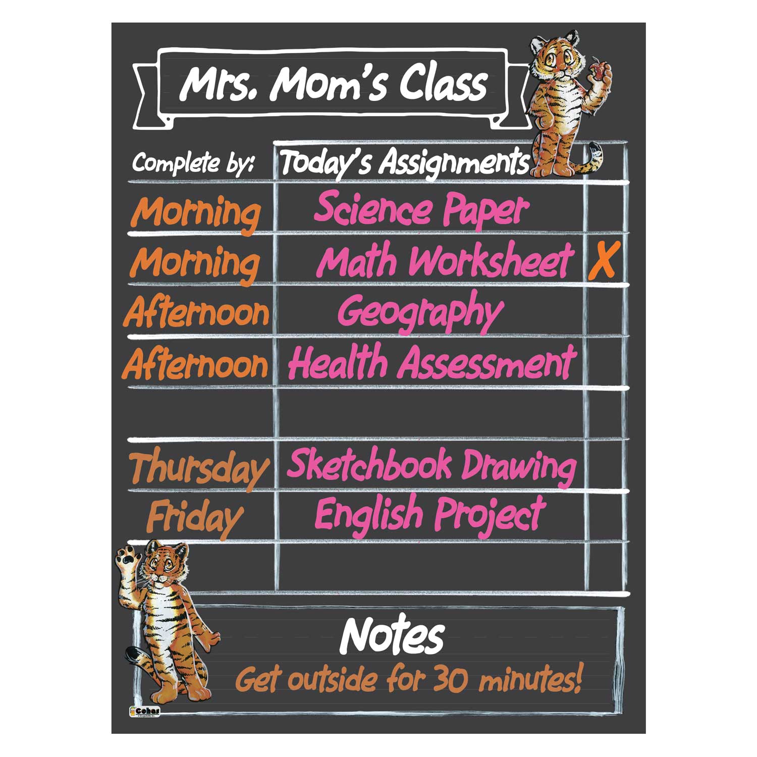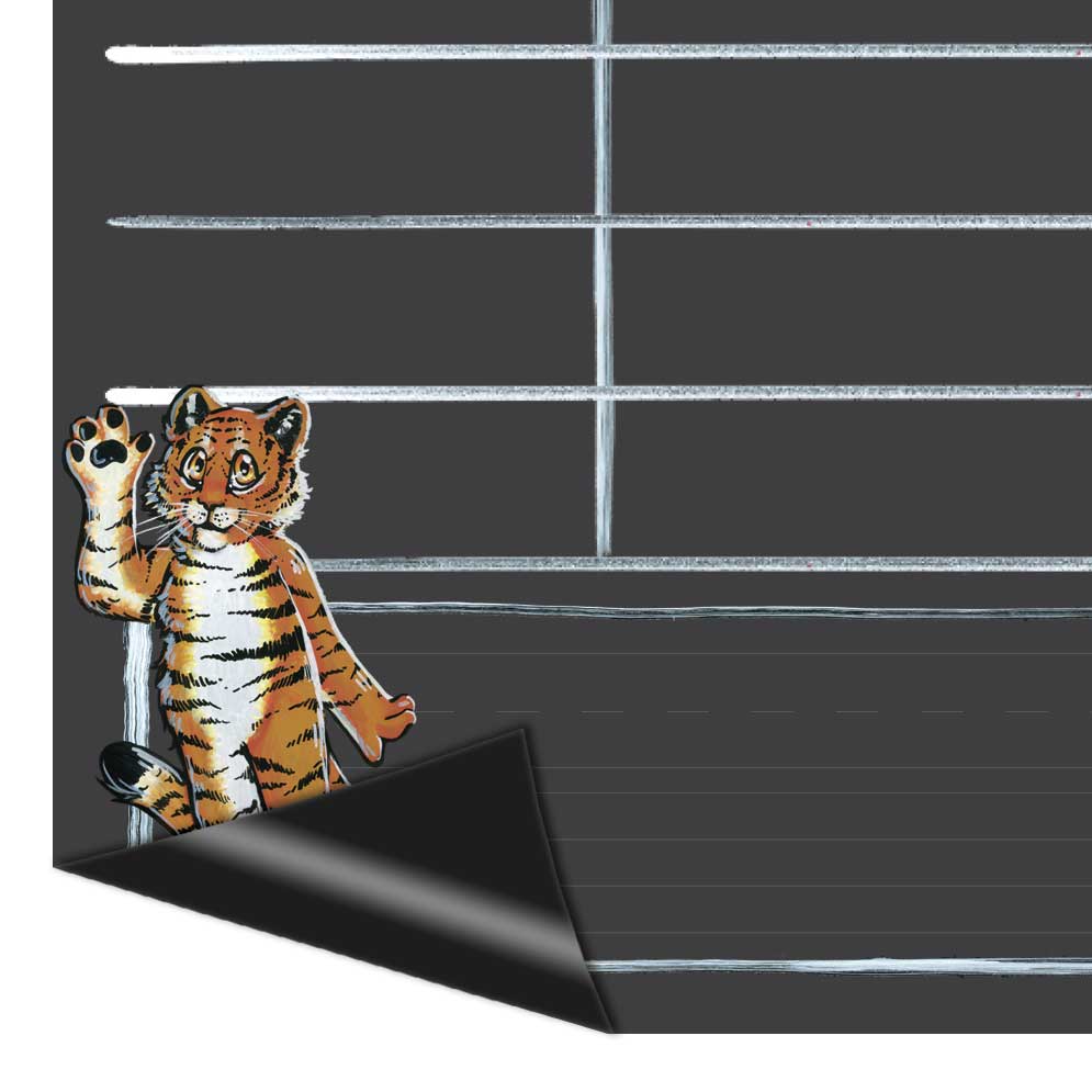Tiger mascot magnetic backed daily planners feature a chalkboard style surface on a magnetic backed flexible board that can be hung on a fridge or other metal surface. They are perfect for remote learning and homeschooling schedules each day. The boards feature real chalk artwork; chalk lines and boxes to write and mark complete each task; and a box at the bottom of the chart to write notes, rewards, reminders, and words of encouragement for your family.