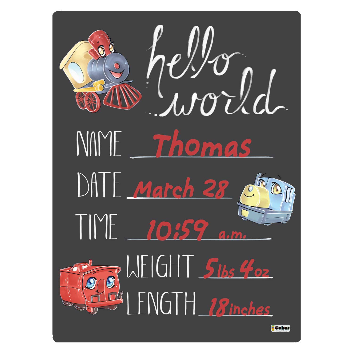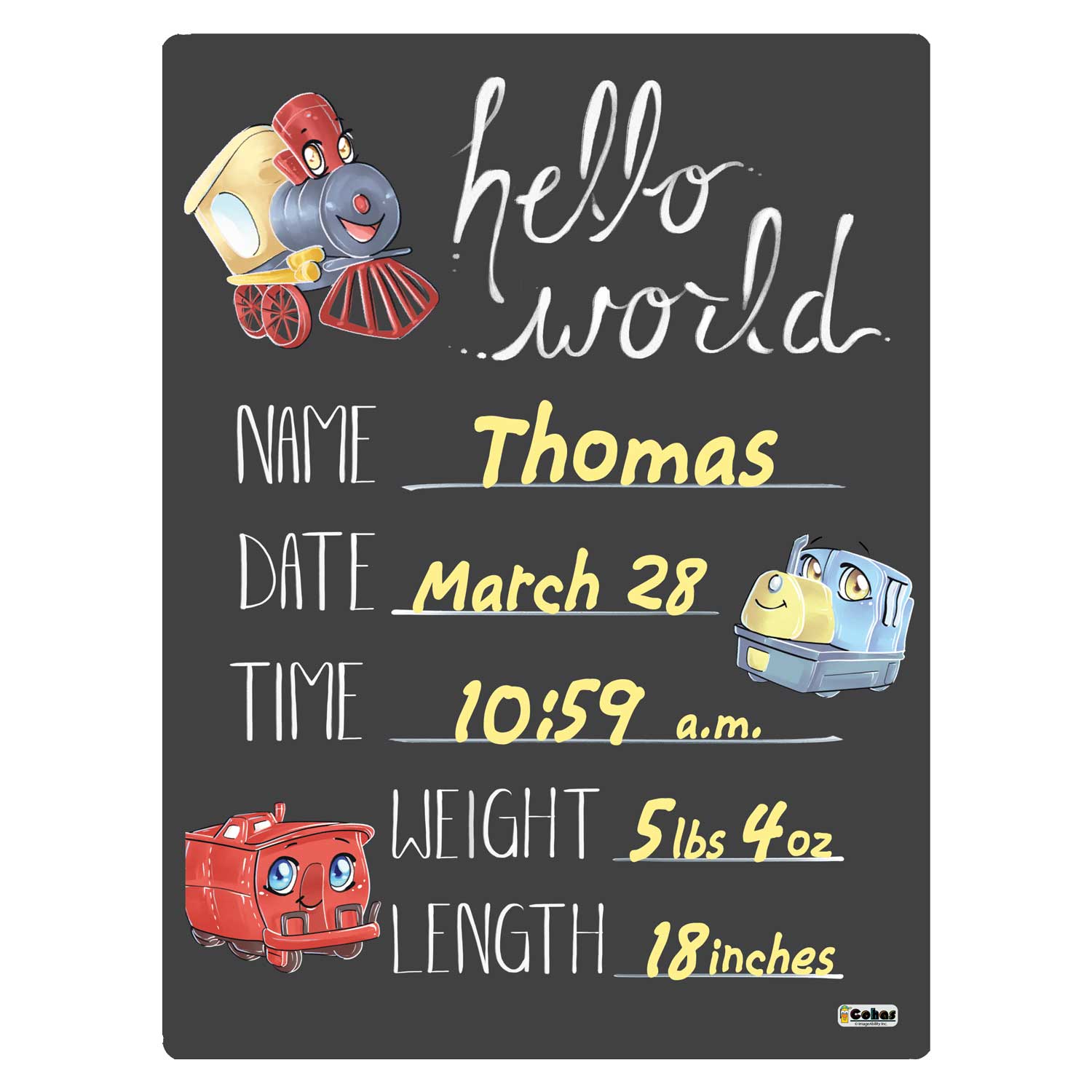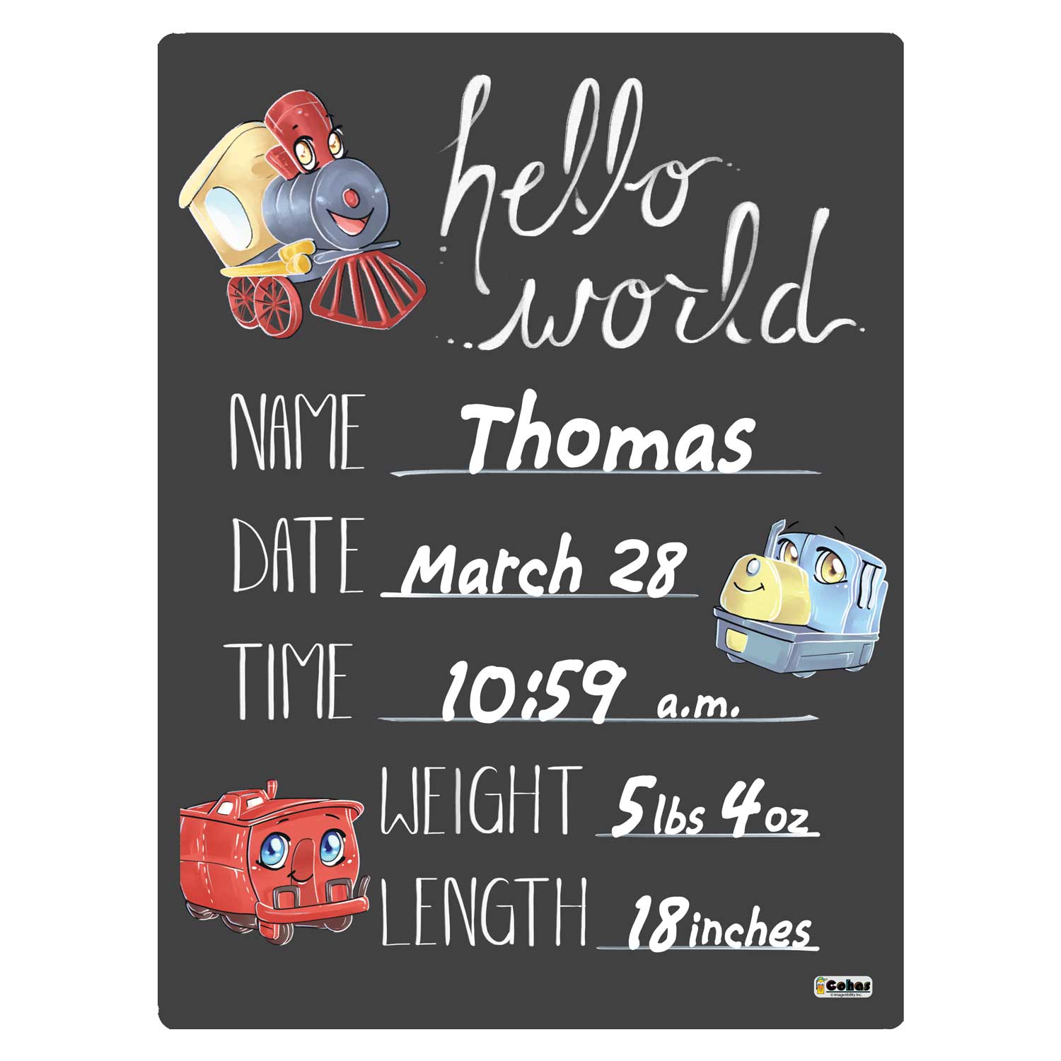 Cohas train theme newborn baby announcement chalkboards are easy to use. Simply write your child’s name, birth date, and relevant birth information and allow to dry. Once the photo shoot is over, use the birth announcement board as a keepsake by hanging or framing. Some marker inks can be removed so the board can be used again. To reuse, remove marker ink from board immediately for best results. Use water or gentle cleanser to remove the ink. Do not use abrasive cleaners or magic erasers; they will damage the board’s surface. Chalk will not work on the board.
