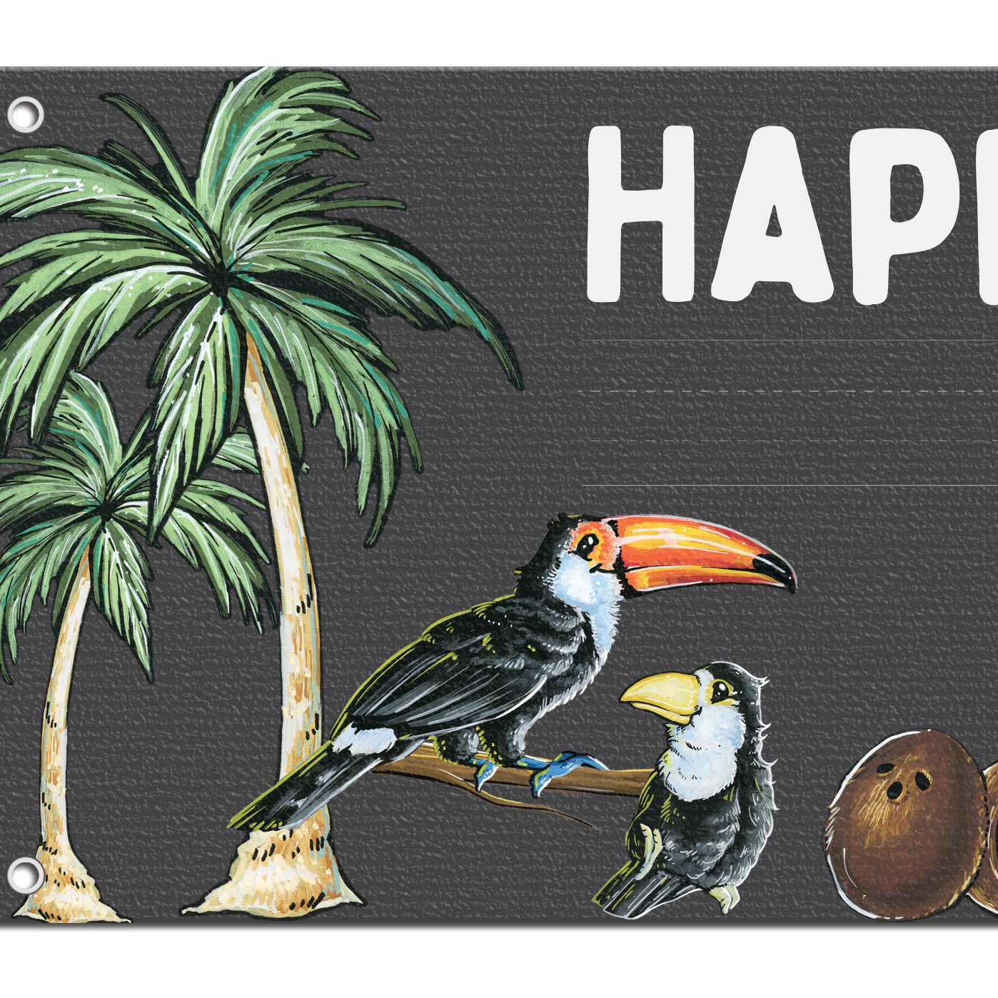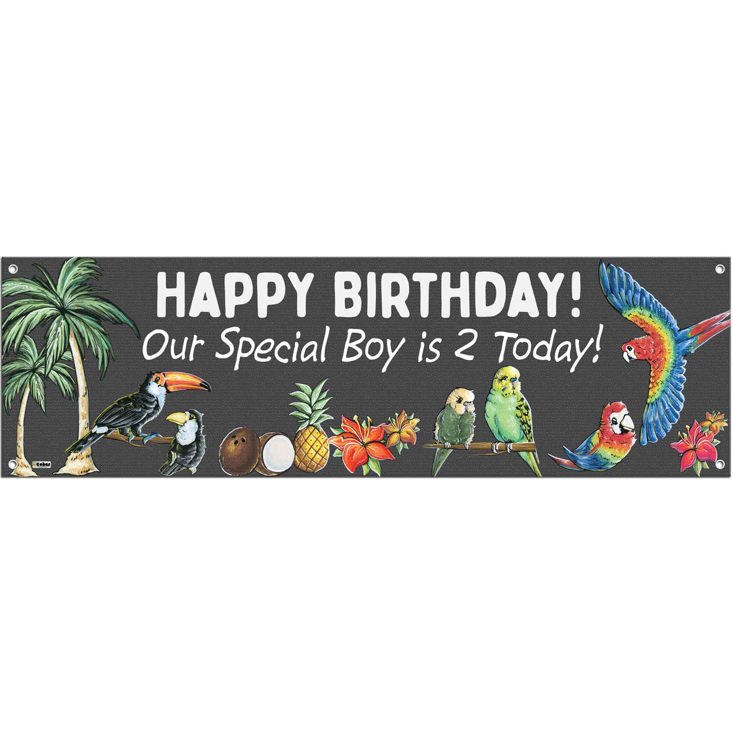 Cohas tropical bird theme happy birthday banners are perfect for birthday parties and celebrations. This bird of Rio themed banner features palm trees, a toucan and chick, a budgie parakeet and baby, a macaw parrot and chick, and colorful flowers and fruit from paradise.
