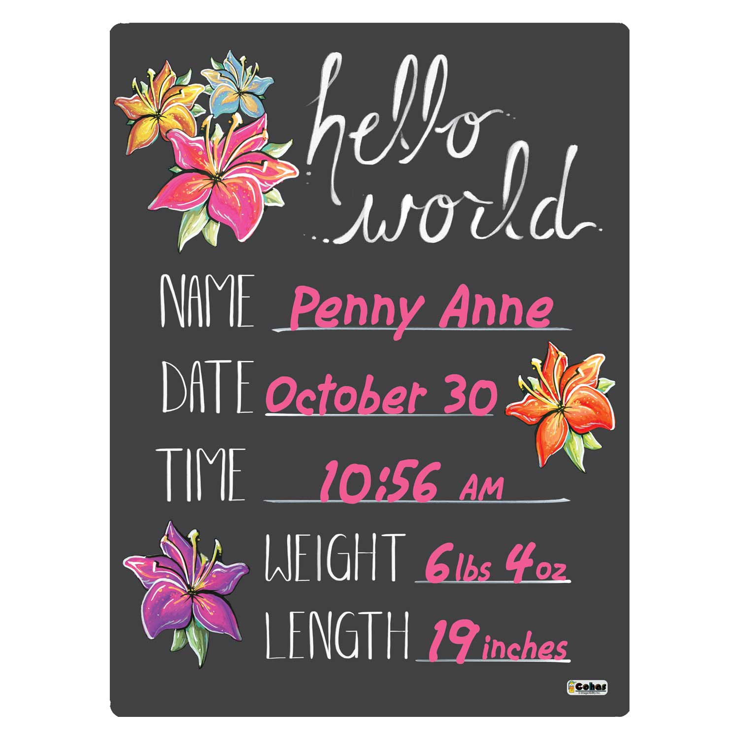 Cohas tropical flower theme newborn baby announcement chalkboards are easy to use. Simply write your child’s name, birth date, and relevant birth information and allow to dry. Once the photo shoot is over, use the birth announcement board as a keepsake by hanging or framing. Some marker inks can be removed so the board can be used again. To reuse, remove marker ink from board immediately for best results. Use water or gentle cleanser to remove the ink. Do not use abrasive cleaners or magic erasers; they will damage the board’s surface. Chalk will not work on the board.