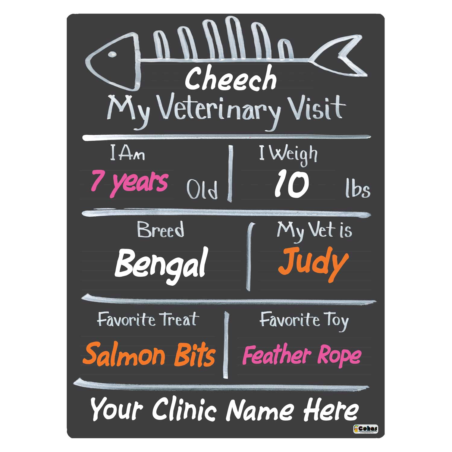 Cohas vet visit milestone boards for cats feature a commercial-grade surface that prevents staining. Boards are easy to clean and reuse when used with the included or recommended markers. Simply use water and a sponge or paper towels to wipe away lettering and designs. Boards that include a marker kit come with Cohas Wet-Wipe Markers. The marker features a reversible 2mm and 6mm tip, perfect for making thick and thin lines. The markers will remove easily with water.