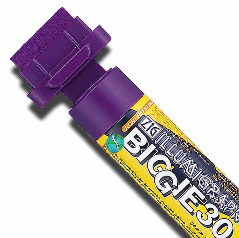 Violet Illumigraph BIGGIE 30mm tip marker features a wide tip for making thick lines. They provide customers a quality liquid chalk ink that is highly fluorescent and opaque. The markers can be used on a variety of surfaces, like Cohas products, classic chalkboards, glass, plastic and more. They are perfect for use adding lettering and decorative art to nonporous surfaces.