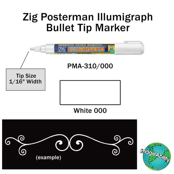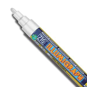 White Illumigraph medium bullet 2mm tip marker features a medium tip for making thin lines. They provide customers a quality liquid chalk ink that is highly fluorescent and opaque. The markers can be used on a variety of surfaces, like Cohas products, classic chalkboards, glass, plastic and more. They are perfect for use adding lettering and decorative art to nonporous surfaces.