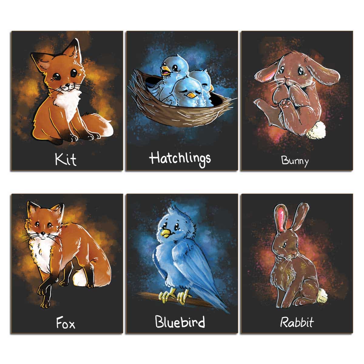 Woodland animal frame-ready prints feature hand painted chalk artwork on a solid board. They are perfect for hanging in baby’s nursery, bedroom, playroom, or around the house. The prints feature baby and adult animals on a chalkboard-like background. A splash of color has been added to make the animals stand out. The type of animal is written in simple chalk lettering, providing a fun learning opportunity for your little one!