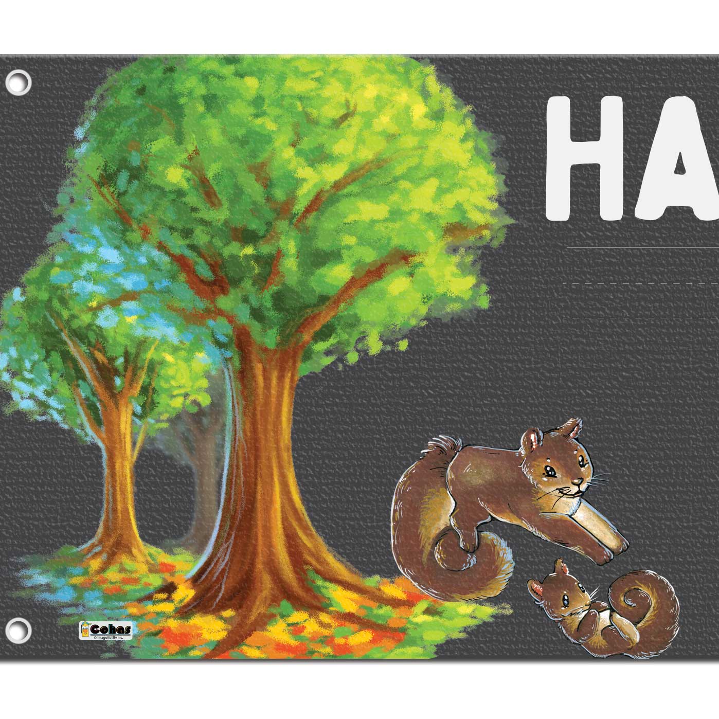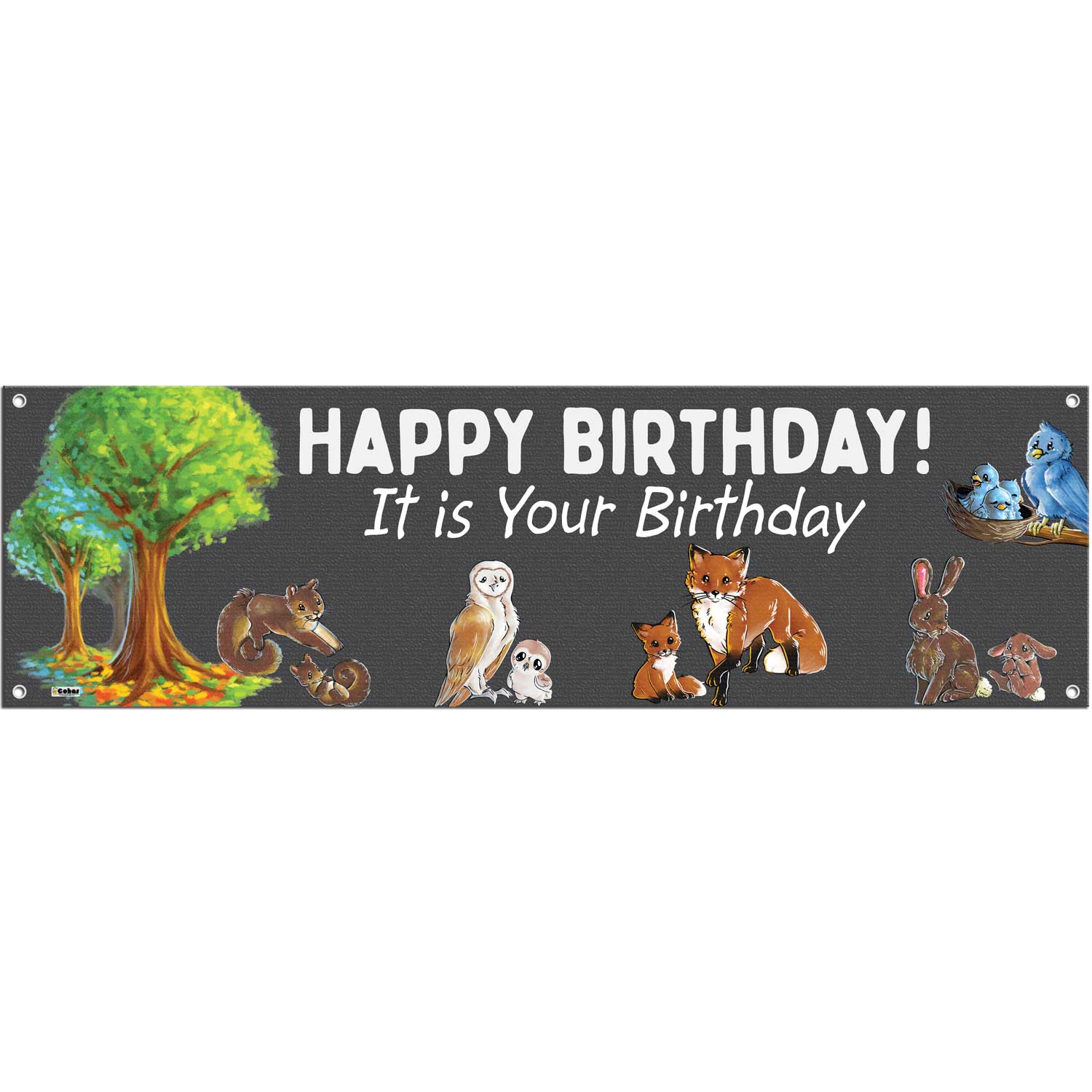 Cohas woodland theme happy birthday banners are perfect for birthday parties and celebrations. This woodland themed banner features trees, squirrels, dad and baby owl, mom fox and kit, mom and baby bunny rabbit, and bluebird with her chicks in a nest.