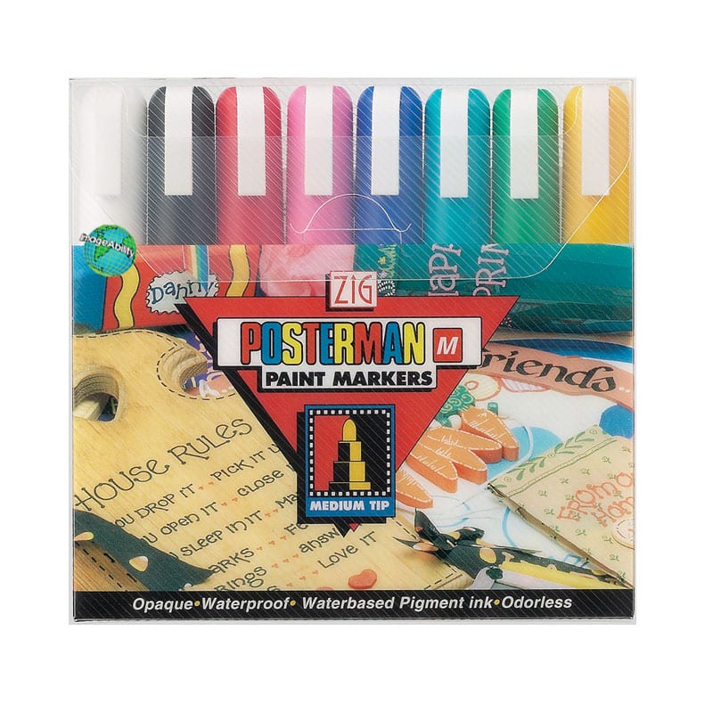 Zig Posterman waterproof medium 2mm tip 8 marker wallet set is perfect for creating many colorful thin lines. The markers provide customers a quality liquid chalk ink that is highly opaque and waterproof. The clear plastic wallet provides a neat and sturdy storage box. The markers can be used on a variety of surfaces, like Cohas products, classic chalkboards, glass, plastic and more. They are perfect for use adding lettering and decorative art to nonporous surfaces.