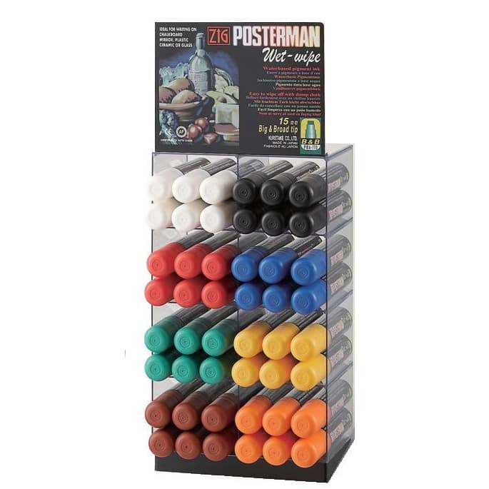 Zig Posterman wet-wipe broad 15mm tip 4 dozen marker display case features a display that holds 48 markers and 48 markers in a variety of colors. The markers feature a wide tip for making thick and thinner lines. They provide customers a quality liquid chalk ink that is highly opaque. The markers can be used on a variety of surfaces, like Cohas products, classic chalkboards, glass, plastic and more. They are perfect for use adding lettering and decorative art to nonporous surfaces.