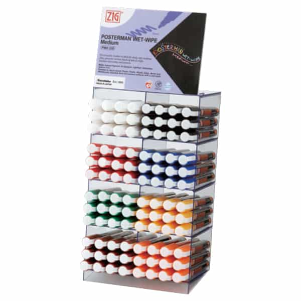 Zig Posterman wet-wipe bullet 2mm tip 8 dozen marker display case features a display that holds 96 markers and 96 markers in a variety of colors. The markers feature a medium tip for making thin lines. They provide customers a quality liquid chalk ink that is highly opaque. The markers can be used on a variety of surfaces, like Cohas products, classic chalkboards, glass, plastic and more. They are perfect for use adding lettering and decorative art to nonporous surfaces.